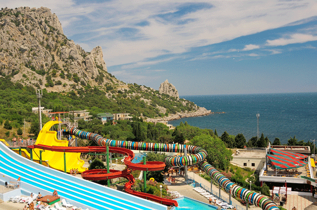 — с 10:00 до 18:00 детский — 140 грн., взрослый — 220 грн.; Если вы, например, приезжаете в 12:30, можете заплатить 70 гривен за ребенка и 160 гривен за взрослого, но вам нужно будет покинуть аквапарк уже через полчаса, в 13:00. Удобно приезжать пораньше, к открытию, пока в парке мало людей, или перед «второй сменой», которая начинается в 14:00. Первый и единственный аквапарк Крыма, где в бассейнах и на аттракционах используется настоящая чистая морская вода, которую меняют через каждые 12 часов или через 8 — в детских бассейнах. Расположен развлекательный комплекс «Голубой залив» в поселке городского типа Симеиз (Южный берег Крыма) в одноименном Голубом заливе. В аквапарке 11 разнообразных аттракционов, среди которых: пятиполосная горка «Мультиписта» высотой 9 метров и протяженностью 34 метра; «Анаконда» — длина спуска 154 метра; «Камикадзе» — высота горки 15 метров, скорость спуска достигает 6,5 метров в секунду, а также несколько бассейнов, в том числе волновой. Детский комплекс включает бассейн «Восьмерка» и 4 аттракциона: 18, 20, 21 и 23 метров длиной и 1,9, 2,0, 2,2 и 2,4 метров высотой. Средняя скорость спуска с горок — 2 метра в секунду. На территории «Голубого залива» расположены пиццерия «Челентано», лаунж-кафе и два бара. Кроме того, к услугам отдыхающих: камеры хранения, раздевалки, душевые, туалеты, медпункт, банк с обменным пунктом, торговая галерея, где можно приобрести все необходимые пляжные принадлежности и сувениры, площадка для пляжного волейбола, автостоянка, а также VIP-зона. Как добраться в аквапарк «Голубой залив»?Из Ялты: от остановки «Вещевой рынок», гостиницы «Ореанда» и клуба моряков (ул. Рузвельта) на маршрутном такси № 36 (каждые 20 минут) прямо к воротам аквапарка. Личным автотранспортом: с трассы Ялта—Севастополь поворот на Понизовку, далее по указателям на Аквапарк.