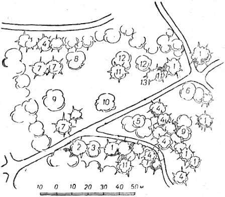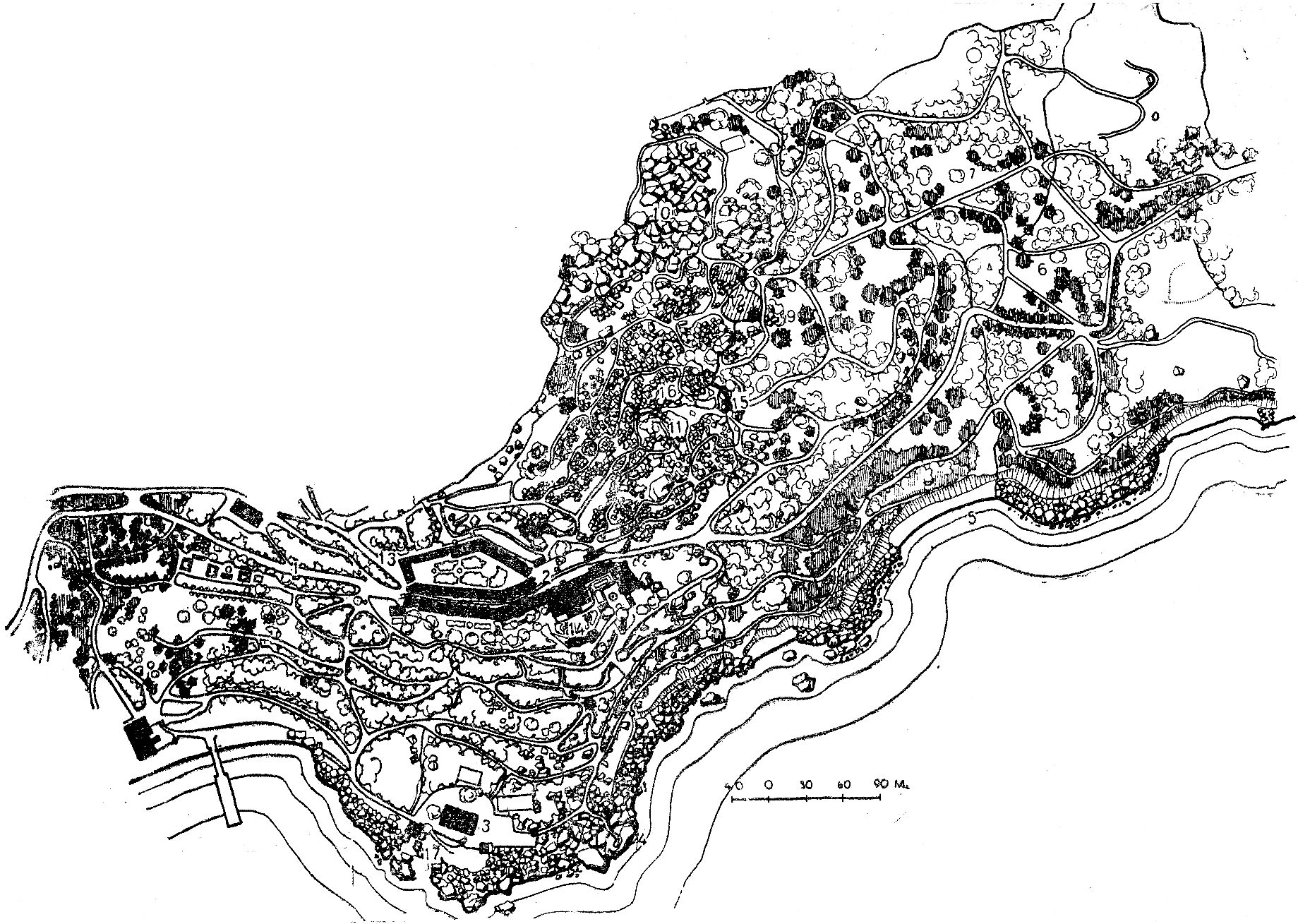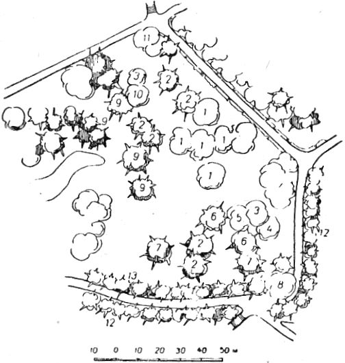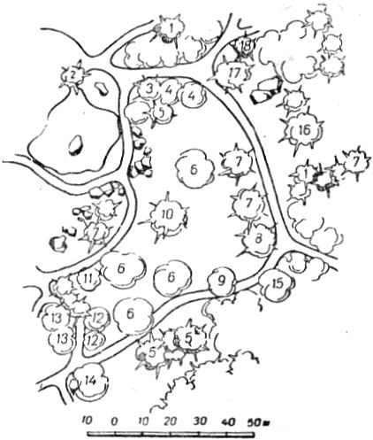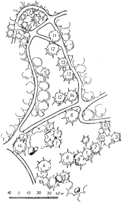 ПаркОгромный парк, примыкающий к дворцу, был, очевидно, заложен с ним в одно время. Работами по планировке и устройству парка руководил садовод Кебах, но он, очевидно, не является его единственным создателем. Часть парка, непосредственно примыкающая к дворцу, тесно связана с архитектурным ансамблем дворцового комплекса и, по всей вероятности, в ее проектировании непосредственное участие принимали Блер и Гунт. Парк занимает территорию около 40 га. (рис. 1). С востока на запад он протянулся на 1 км, а с юга на север на 0,5 км. Начинаясь непосредственно у морского пляжа, он подымается по склону до самого подножия живописных скал. Рельеф крутой, обрывистый в верхней северной части, по мере приближения к морю постепенно смягчается, образуя более пологие складки и покатости. В зависимости от характера рельефа всю территорию парка схематично можно подразделить на три зоны: северную, верхнюю, крутую с нагромождением скал, являющуюся как бы миниатюрным продолжением каменистого хаоса Ай-Петринского склона Яйлы; среднюю, с мягкими всхолмлениями и неглубокими оврагами; нижнюю, обрывистую и каменистую, примыкающую к морю. Парк имеет 4 входа: восточный со стороны Ялтинского нижнего шоссе; северо-западный, соединяющий парк с центром города; западный по дороге, ведущей в Симеиз; и приморский со стороны пароходной пристани. С востока на запад парк пересекают три основные магистрали. Северная магистраль соединяет восточный вход с северо-западным, центральная, раньше служившая транзитной дорогой между Ялтой и Симеизом, проходит через всю территорию парка с востока на запад и является главным подъездным путем к дворцовому комплексу со стороны нижнего шоссе; приморская идет от восточного входа параллельно берегу моря к пароходной пристани. Алупкинский парк создавался в период интенсивного строительства в России парков ландшафтного типа, вытеснявших господствующий до этих пор регулярный тип. На первых этапах развития этого направления естественная природа сильно идеализировалась. Ландшафтам придавали «романтический вид» «диких местностей», «заросших развалин» и т. п., характерный для пейзажей, изображенных на картинах лучших мастеров живописи эпохи романтизма — Клод Лорэна, Рюйсдаля и др. Рис. 1. План парка. 1 — главная аллея; 2 — дворец; 3 — чайный домик; 4 — скала Айвазовского; 5 — пляж; 6 — каштановая поляна; 7 — контрастная поляна; 8 — солнечная поляна; 9 — платановая поляна; 10 — Большой хаос; 11 — Малый хаос; 12 — озеро; 13 — источник «Трильби»; 14 — львиная терраса и фонтаны; 15 — двойной каскад; 16 — каскад у самшитовой рощи; 17 — Рыбачья пристань Парк в Алупке был задуман как ландшафтный, близкий к природе. Его главным художественным достоинством является гармоническое единство с окружающим ландшафтом. Хотя в его пейзажах много элементов романтичности, однако они реалистичнее, чем в других современных ему парках. Форма рельефа, характер, назначения и планировка территории, особенности композиции пейзажей позволяют подразделить парк на следующие архитектурно-планировочные районы: Большой хаос, Малый хаос, Пейзажный — в верхней части парка, расположенной выше главного шоссе; Центральный, Восточно-приморский и Западно-приморский — в нижней части. Район Большого хаоса непосредственно примыкает к подножию скалистого Ай-Петринского хребта и предст