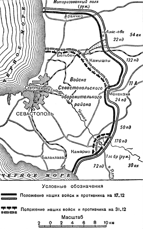 Второй штурм СевастополяНемецко-фашистское командование после отражения первого штурма не отказалось от своей цели овладеть Севастополем. Организуя новое наступление, оно понимает, что имеющихся под Севастополем четырех дивизий явно недостаточно. Командованию 11-й армии необходимо подтянуть к Севастополю максимально возможные силы. Оно стало перебрасывать под Севастополь войска из других районов Крыма. Из района Керчи были направлены 170-я и 73-я немецкие пехотные дивизии и 1-я румынская горнострелковая бригада. Во второй половине ноября из резерва группы армий «Юг» прибыла 24-я немецкая пехотная дивизия и из 3-й румынской армии 4-я горно-стрелковая бригада. Для нового штурма Севастополя фашистское командование могло привлечь семь пехотных дивизий и две горно-стрелковых бригады. Для усиления артиллерийской группировки с целью разрушения долговременных оборонительных сооружений и для борьбы с береговыми батареями в район Севастополя было переброшено несколько батарей тяжелой артиллерии, включая орудия 360-мм калибра. Всего к началу второго штурма у противника было 645 полевых, 252 противотанковых орудия и 378 минометов, в том числе и шестиствольных, а всего 1275 единиц. Противник также подтягивал танки (до 150 машин) и авиацию (до 300 самолетов). Превосходство противника по танкам было почти шестикратное (у севастопольцев было 26 легких танков), по авиации — в 3,3 раза (300 против 90). Силы СОРа состояли из четырех прежних стрелковых дивизий (2, 172, 25 и 95-я), укомплектованность которых составляла 40%, вновь прибывшей 388-й стрелковой дивизии, которая была укомплектована до 100% штата, и 40-й кавалерийской дивизии 20%-ной укомплектованности. Соотношение сил по людям составляло 1,7 в пользу противника. Артиллерия Приморской армии насчитывала 191 орудие, артиллерия береговой обороны — 111 орудий и артиллерия ПВО — 108 орудий, а всего 410 орудий. Имелось также 120 минометов калибра 82—120 мм. Превосходство противника по артиллерии было в 2,5 раза в его пользу. Замысел противника по овладению Севастополем заключался в одновременном нанесении ряда ударов с нескольких направлений с тем, чтобы лишить обороняющихся возможности сосредоточивать усилия обороны на одном атакованном участке, нанося главный удар с северо-востока в направлении Северной бухты с целью быстрейшего выхода к порту.