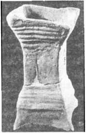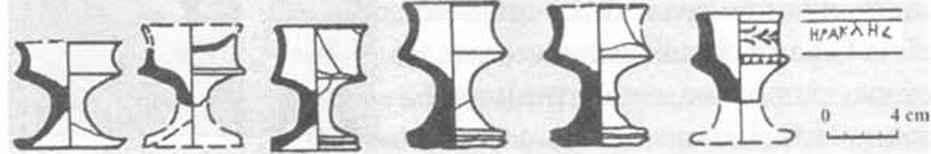 Говоря о домашних святилищах, нельзя не обратить внимание на чашки цилиндрической формы на высокой ножке, изготовленные из херсонесской глины, с сильно профилированными подставками. На поверхность одного из них тусклой красновато-коричневой краской была нанесена роспись, состоявшая из семи горизонтальных поясов. На другом — роспись, выполненная по ангобу коричневой краской, состояла из мелких листьев и огибала стенки сосуда. В ее центре было прочерчено граффити с посвящением Гераклу. Сверху, на ободке нижней части стенок, имелись следы изображения ов. Аналогичные сосуды найдены не только в Херсонесе, но и на античных поселениях в Северо-Западной Таврике.