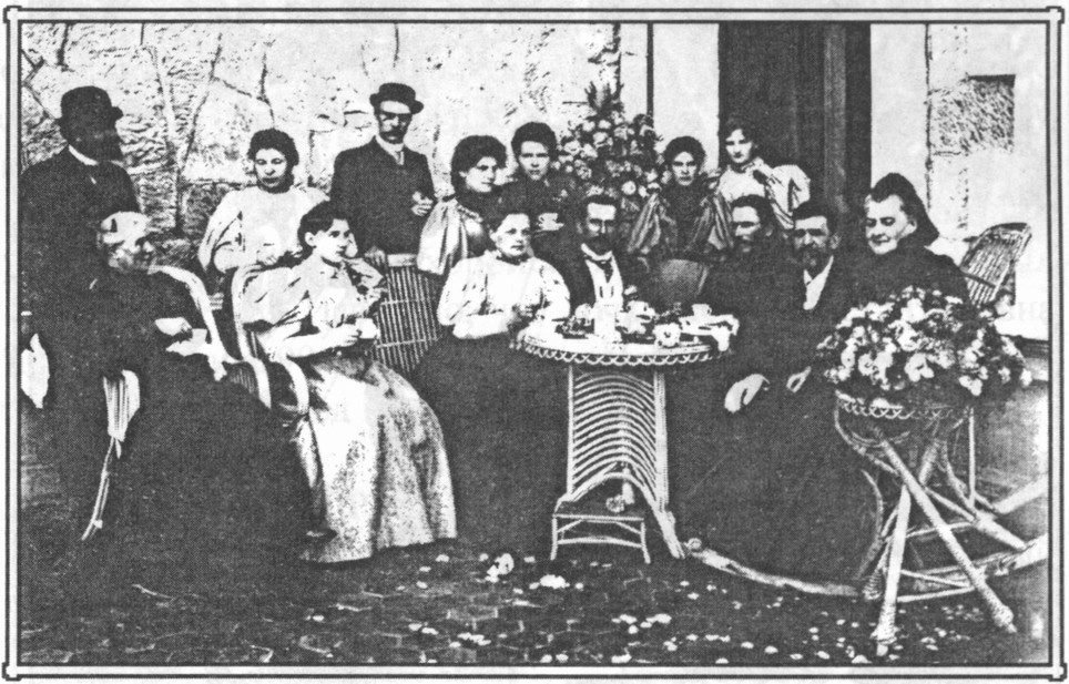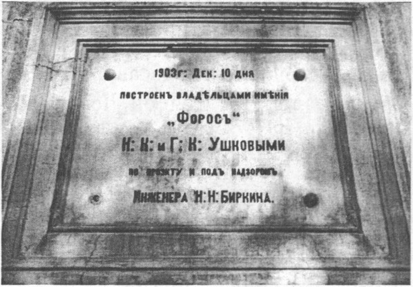 Уникальная фотографияФотоснимок, действительно редкий и долгожданный. На нём впервые можно увидеть Константина Капитоновича Ушкова со своей первой женой Анной Григорьевной, сестрой «чайного короля» А.Г. Кузнецова (за столом), позади стоит их сын, последний владелец имения «Форос» Григорий Ушков. Правее (за столом) — священник Павел Ундольский. Личности остальных ещё не установлены. В этом смысле фотография ещё не разгадана, и автор надеется на помощь читателей. Фотография датируется примерно 1897 годом. Наследники имения Ушковы и гости позируют на веранде кузнецовского дворца. После смерти первой жены Константин Капитонович женился вторично на красавице Терезе Валентиновне Элоухен. У них были две дочери Лена — 1906 и Таня — 1909 года рождения. Родная сестра Терезы — Мария Валентиновна Петцольд стала второй женой Федора Шаляпина. Константин Капитонович совместно с сыном Григорием управлял имением «Форос» и продолжал его благоустраивать. Благодаря их стараниям парк пополняется новыми редкими экзотическими растениями.