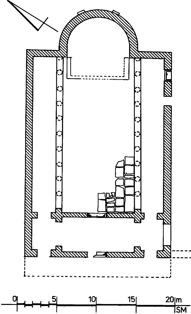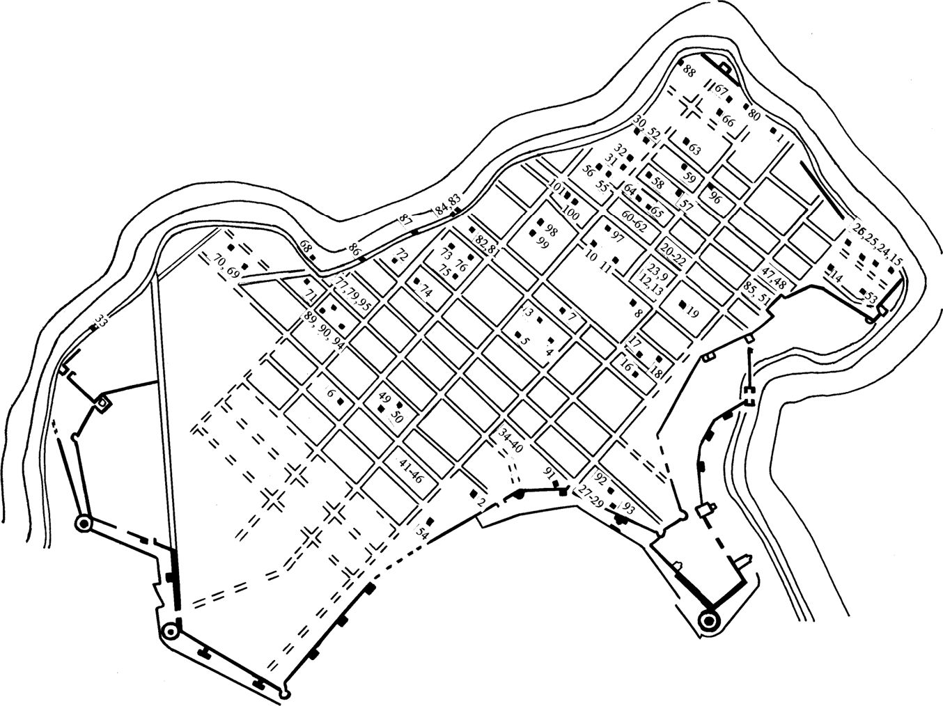 «Примат концепции», или факты: к вопросу о синагогеПоявление адептов новой веры (даже в небольшом количестве) должно было найти отражение в материальной культуре. Но к настоящему времени памятников, которые уверенно можно соотнести с христианскими сакральными постройками IV в., в Херсонесе пока не обнаружено. Для начального периода христианства местом отправления культа в Херсоне, как полагает В.М. Зубарь, могли являться места захоронений в соответствии с раннехристианской традицией1. В качестве примера он называет пещерообразное подземное сооружение около башни XVII2. Кроме того, к их числу ученый вслед за М.И. Ростовцевым относит склеп, открытый на земле Н.И. Тура, который позднее был перестроен в часовню3. Среди наиболее ранних сакральных сооружений некоторые историки Херсона упоминают еще два комплекса: подземный храм на главной улице, выявленный раскопками Одесского общества истории и древностей, и «базилику на холме», открытую К.К. Косцюшкой-Валюжиничем. Возвращением к изучению памятника стали раскопки 70-х гг. XX в. С.А. Беляева. Повторное изучение показало наличие двух разновременных храмов: раннего «Б» с мозаичным полом и позднего «А». Автор раскопок предположил, что базилика «Б», возвышающаяся над северной частью города, являлась кафоликоном. Она была действующей в IV—VIII вв. После ее разрушения возводится базилика меньших размеров4. Обращение других исследователей (И.А. Завадской, А.И. Романчук, С.Б. Сорочана) к анализу находок из заполнения колодца, засыпанного перед началом раннего строительства, привело к выводу, что «стратиграфические аргументы» С.А. Беляева не подтверждают предложенную им датировку. Хронологическая последовательность строительства на участке представляется следующим образом: с последней трети VI в., возможно, с начала VII в. и до конца X в. функционирует ранний храм5; более поздний, вероятнее всего, возведен в начале XI в.; затем к югу от комплекса «базилика на холме» построена часовня (по мнению автора раскопок, это произошло в XI в.). На расстоянии 16,0 м от нее открыта еще одна часовня. Возможно, обе часовни являлись действующими в поздневизантийский период6. Одним из мест отправления культа до возведения базиликальных храмов, согласно мнению С.А. Беляева, мог служить подземный храм (мартирий раннехристианских мучеников) в квартале III. В последующем над ним был построен небольшой однонефный храм (по плану ИАК № 35)7, планировка которого фактически не отличается от квартальных сакральных зданий. Близкая точка зрения принадлежит А.Л. Якобсону, датировавшему крипту раннесредневековым периодом и полагавшему, что позднее над ней возведен храм небольшого размера8. Другое мнение: крипта-часовня и наземный храм являются одновременными — принадлежит С.Б. Сорочану9. С ним отчасти солидарен Ю.М. Могаричев10. Рис. 9. План расположения рыбозасолочных цистерн (по состоянию на 2002 г.) Все, кто обращался к интерпретации подземного храма, отмечали, что ранее здесь находилась рыбозасолочная цистерна, правда, определить время ее использования не представляется возможным. Безусловно, при отсутствии документации о раскопках участка в целом сложно определить последовательность строительства: цистерна—подземный храм—наземная церковь. Однако можно привести некоторые косвенные соображения, отчасти способствующие ориентации 