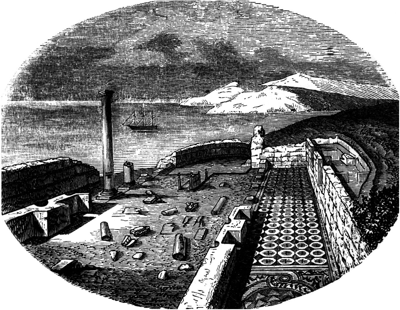 Первый период раскопок: 1827—1876 гг.После Н.(К.) Крузе в 1845 г. разрешение производить раскопки получил член Одесского общества истории и древностей И.П. Бларамберг (1772—1831), но они не состоялись. Спустя почти 20 лет после первого обращения к памятникам Херсонеса незначительные работы на городище предприняты прибывшим из Керчи Д.В. Карейшей, который наделся обнаружить находки, подобные тем, что были извлечены из скифских курганов. Для того чтобы получить представление о характере археологической деятельности первой половины XIX в., о том, что и как искали «исследователи», нанося подчас непоправимый вред памятникам, достаточно обратиться к работам Д.В. Карейши. Алексей Сергеевич Уваров В 1846—1847 гг. Д.В. Карейша производил раскопки некрополя, а затем и Херсонесского городища. Свое появление в Херсонесе он объясняет следующим образом: «Разрытие около Керчи с каждым годом дает все менее и менее археологической добычи». Привыкший получать быстрые результаты во время прославивших его кладоискательских работ в Восточном Крыму, Д.В. Карейша был разочарован первыми результатами. Относительно «исследований» некрополя он писал, что попытка отыскания древних склепов или катакомб оказалась неудачной: ни в 1846, ни в 1847 г. ему не удалось обнаружить ни одного неразграбленного захоронения. Это явилось причиной «переноса изысканий» на территорию городища. «Там я стал производить раскопки в разных местах, углубляясь до материка (траншеи, о которых идет речь, были заложены около оборонительных стен, возможно, около античных ворот). ...Употребив здесь много времени, трудов и издержек без всякого успеха, я начал после этого разработку одного очень широкого и плоского кургана, почти на самом берегу моря. ...Но и в этом месте разработки мои не были удачнее»1. Сохранились сообщения и о других раскопках тех лет. В частности, З. Аркас сообщал в 1851 г. в Одесское общество истории и древностей, что лейтенант Шемякин открыл здание с мозаичным полом, расположенное на северном берегу моря. На стенах его сохранилась штукатурка с росписью. Упоминаемое здание оказалось базиликой. В последующем под наблюдением графа А. Уварова (1825—1884) Шемякин принимал участие в ее изучении (по плану Археологической комиссии — № 23, или базилика Уварова). Уваровская базилика. Гравюра XIX в. В сущности, раскопки А. Уварова в 1853 г. являются первыми, которые были более или менее подробно описаны2. В 1852 г. там, где некогда располагался Херсонес, основана киновия. С этого времени раскопки на городище производил настоятель монастыря Евгений. Археологическая деятельность активизировалась в 1861 г. в связи с началом возведения Владимирского собора в память крещения Руси на центральной площади древнего города над одним из храмов, обнаруженных Крузе. Подготовка участка для строительства привела к выявлению 5 храмов и часовни. План сооружений был опубликован членом Одесского общества истории и древностей Н.Н. Мурзакевичем. Но, к сожалению, свидетельства об археологических открытиях не сопровождает описание материалов, позволяющих судить, в какой последовательности возводились сакральные здания. О научной значимости раскопок монастыря и представлении, которое сложилось в тот период о руинах Херсонеса, можно судить по переписке председателя Московского археологического общества графини П.С. Уварово