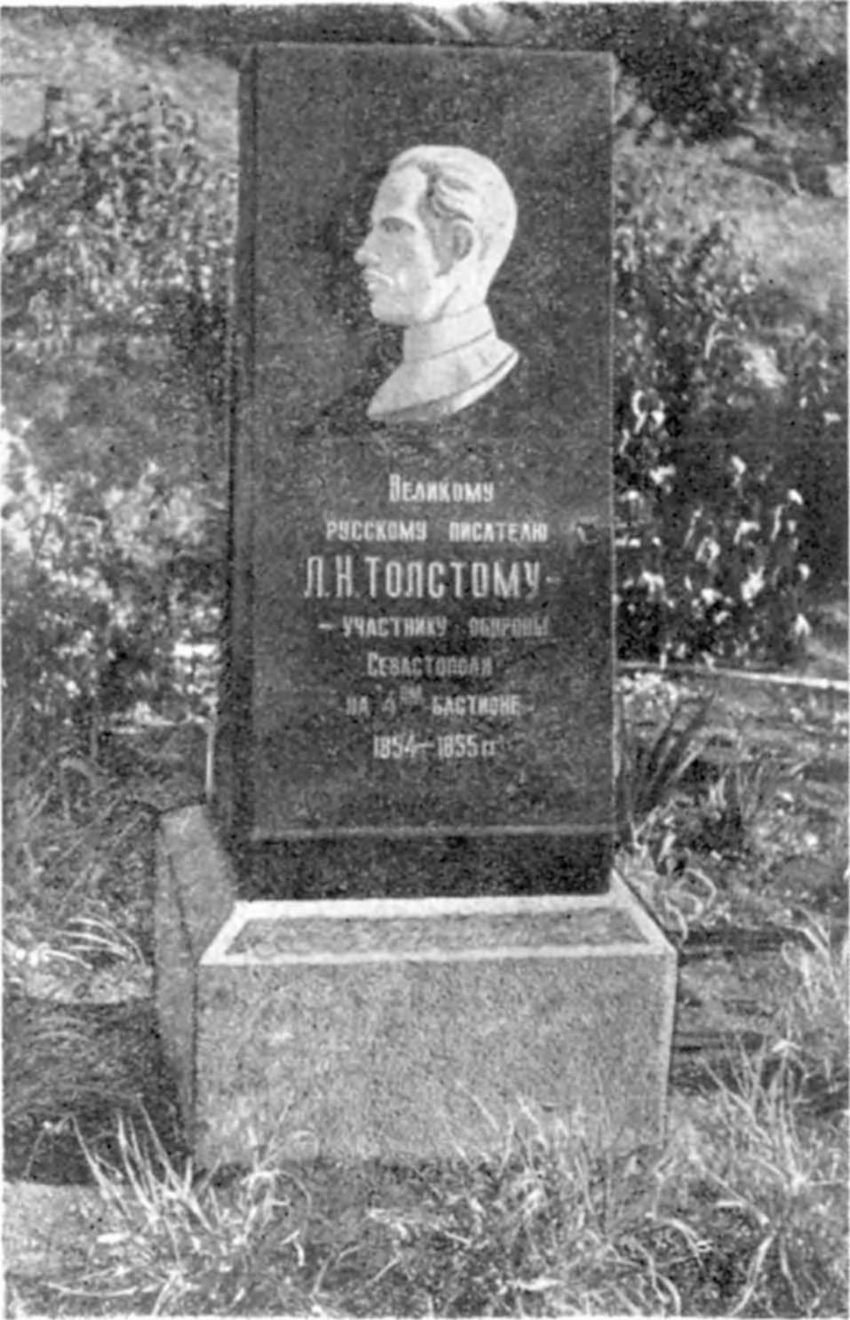Памятник Л.Н. ТолстомуНа 4-м бастионе установлен памятник (стела) Л.Н. Толстому. Л.Н. Толстой, тогда подпоручик артиллерии, прибыл в Севастополь в ноябре 1854 г. Он перевелся сюда из Дунайской армии «больше всего, — как объяснял он, — из патриотизма». Своему брату Толстой писал: «...Город осажден с одной стороны, с южной, на которой у нас не было никаких укреплений, когда неприятель подошел к нему. Теперь у нас на этой стороне больше 500 орудий огромного калибра и несколько рядов земляных укреплений, решительно неприступных. Я провел неделю в крепости и до последнего дня блудил, как в лесу, между этими лабиринтами батарей. Дух в войсках выше всякого описания. Во время древней Греции не было столько геройства». Зимой и весной 1855 года Толстой, находясь на позициях у Бельбека, часто ездил в осажденный город. В ночь на И марта он добровольно участвовал в крупной вылазке в расположение врага за Малаховым курганом. 30 марта Толстой был переведен из Бельбека на Язоновский редут 4-го бастиона. Его батарея попала на позицию в то время, когда французы в течение десяти дней осуществляли второе усиленное бомбардирование. За участие в бою Толстому был присвоен чин поручика. Здесь он пробыл полтора месяца, деля с защитниками бастиона все опасности. Во время кратковременных передышек Толстой написал первый из знаменитых «Севастопольских рассказов» — «Севастополь в декабре месяце». Этот рассказ принес Толстому литературную славу и явился важной вехой в его творческой биографии. В мае Толстому было поручено сформировать и взять под свое командование отдельный артиллерийский взвод из двух легких горных пушек. Взвод первое время стоял на Черной речке, а затем на Бельбеке. В июне Лев Николаевич написал второй рассказ — «Севастополь в мае». Общим фоном для рассказа послужил бой в ночь с 10 на 11 мая, свидетелем которого был Толстой, находясь на четвертом бастионе. С Бельбека Толстой часто приезжал в Севастополь, особенно в дни, когда на оборонительной линии вспыхивали горячие схватки. Когда началась общая бомбардировка Севастополя, он не смог оставаться на Бельбеке. В последний день обороны Толстой, получив в командование пять пушек, участвовал в отражении вражеских атак. Об этом он писал в одном из писем: «Я имел счастье и несчастье прибыть в город как раз в день штурма; так что я присутствовал при этом и даже принимал некоторое участие как доброволец». Тяжело переживал Толстой оставление Севастополя и переход наших войск на Северную сторону: «Я плакал, — писал он, — когда увидел город, объятый пламенем, и французские знамена на наших бастионах». Последние дни обороны Севастополя изображены Толстым в третьем рассказе — «Севастополь в августе 1855 года», написанном уже после отъезда писателя из Крыма. Три «Севастопольских рассказа» — это непревзойденный художественный памятник обороны 1854—1855 гг. Проникнутые высокой патриотической гордостью и любовью к простым людям, они дышат глубоким убеждением в невозможности «поколебать где бы то ни было силу русского народа» и в том, что «надолго оставит в России великие следы эта эпопея Севастополя, которой героем был народ русский...».