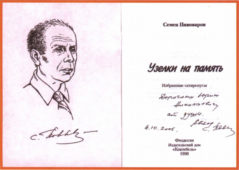 Семен ПивоваровЧетверть столетия назад феодосийского поэта Семена Михайловича Пивоварова знала вся огромная страна. Пивоваровские сатирические поэтические миниатюры часто мелькали в «Клубе 12 стульев» московской «Литературной газеты», а это была самая читаемая страница из всех газет. Да что там читаемая — вырезаемая и специально собираемая, ведь тот «Клуб...» выпускал даже свой книжный альманах, который сегодня лишь изредка попадается на букинистических развалах. Тогда вот и пришла известность, очень заметная и доныне. В 1994 г. он стал лауреатом премии «Золотой теленок» «Клуба 12 стульев»... Была и еще одна газетная страница, правда, городская, которую тоже собирали и хранили лист за листом. Появлялась она каждый месяц и называлась «ФЛЮС» — «Феодосийский листок юмора и сатиры» на страницах городской «Победы» в Феодосии, что вообще уж на самом краю земли. За полтора десятилетия и тут набрался такой томище, что ни один альманах, замысли его кто-нибудь, не выдержал бы этого объема. Семен Михалыч — уж точно один из «белых ворон» в своем почтенном возрасте. А «белые вороны» обычно попадают в черные списки. Наблюдение удивительно точное. Что ж, от планиды не спрятаться. Зато свой мир воспринимается необщим взглядом, зато смеешься над тем, что кажется лапидарным и вечным, зато ты единственный и узнаваемый, а твои суждения, втиснутые в четыре поэтических строки, современники принимают рукоплесканиями. Провоевав всю войну, он пришел ко Дню Победы в Великой Отечественной старшим лейтенантом артиллерии, ну а потом молоденького офицера-фронтовика уже никто ни о чем не спрашивал. Армия стала и жизнью, и судьбой. В отставку ушел полковником. И вот тогда-то, в самом начале 1970-х, став вдруг принадлежать себе, на следующий день он пришел в феодосийское литературное объединение «Рассвет». Стихов было много, мог их читать и показать, мог высказаться толково и лаконично, теорию и историю стиха тоже знал, а главное — не робел. Через неделю литературные наставники уже наперебой рвали нового автора: «Пиши для детей», «Пиши эпос», «Пиши сатиру». И он писал, присматриваясь лишь к внутреннему взгляду на вещи и прислушиваясь к звучанию собственного слова. Не зря ведь был «белой вороной»... Став ярким автором «Победы» и «Литературки», не раз отметился заметными публикациями в половине толстых литературных журналов Советского Союза, в разные годы выпустил семь своих книг, а собственное 80-летие застолбил в 2003-м превосходным поэтическим сборником «Сатиропусы плюс», вышедшим в Феодосии. «Плюс» в его названии — это и дань времени, и структурный элемент книги, вобравшей в себя и лирику, и лаконизмы, и стихи для детей. Автору этих строк посчастливилось в 2003 г. открыть юбилейный сборник феодосийского поэта небольшим предисловием. Я готов повторить, что «ирония — свойство тонкого ума, как и наблюдательность. Их синтез обеспечивает вечность смеховой культуры. Не знаем, спасет ли красота мир, но поэзия и смех спасают его со времен явно дохристианских. Семен Пивоваров остро видит любое явление, ситуацию, процесс. Он вглядывается, обозначает, подводит к нему, оставляя своему читателю пространство для собственных раздумий и оценок. Его сатира не беспощадна, она умна и неназойлива, метка и не пропитана назиданием. Оттого-то поэт и не пишет басен: "рабский жанр" не находит 