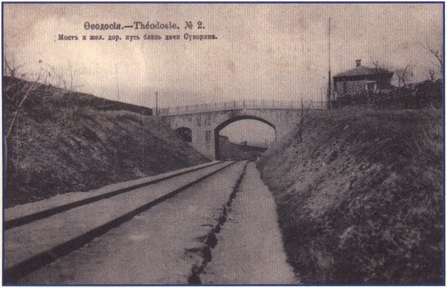 И все-таки первая крымская железная дорога пришла в Севастополь. Это произошло в 1875 г. Очередь Феодосии наступила только через 17 лет. В 1885 г. было принято решение о переводе коммерческого порта из Южной бухты Севастополя в Стрелецкую бухту города или в Феодосию. В 1890 г. вопрос о коммерческом порте трижды обсуждался на заседаниях комитета министров. Сторонники Феодосии (в том числе цесаревич Николай — будущий последний российский император) оказались в меньшинстве, но Александр III принял их сторону, тем самым решив вопрос в пользу Феодосии. Линию железной дороги тянули от станции Джанкой. Кое-где использовали железнодорожные сооружения 1857—1860 гг. Дорогу вели к феодосийскому порту, кратчайший путь к которому с севера проходил по берегу моря. В результате трассу проложили по искусственной насыпи у среза воды. На другой искусственной насыпи, полностью изменившей линию берега в районе порта, возвели портовые сооружения. При возведении насыпей был уничтожен участок песчаного пляжа (не одно поколение феодосийцев безосновательно обвиняет в его гибели И.К. Айвазовского, якобы разрешившего тянуть дорогу именно этим путем). Вблизи дачи книгоиздателя А.С. Суворина железная дорога разрезала возвышенность. Для удобного проезда к дачам и морю в этом месте был поставлен трехарочный каменный мост с ажурной оградой (он находится на стыке проспекта и ул. Д.И. Ульянова).