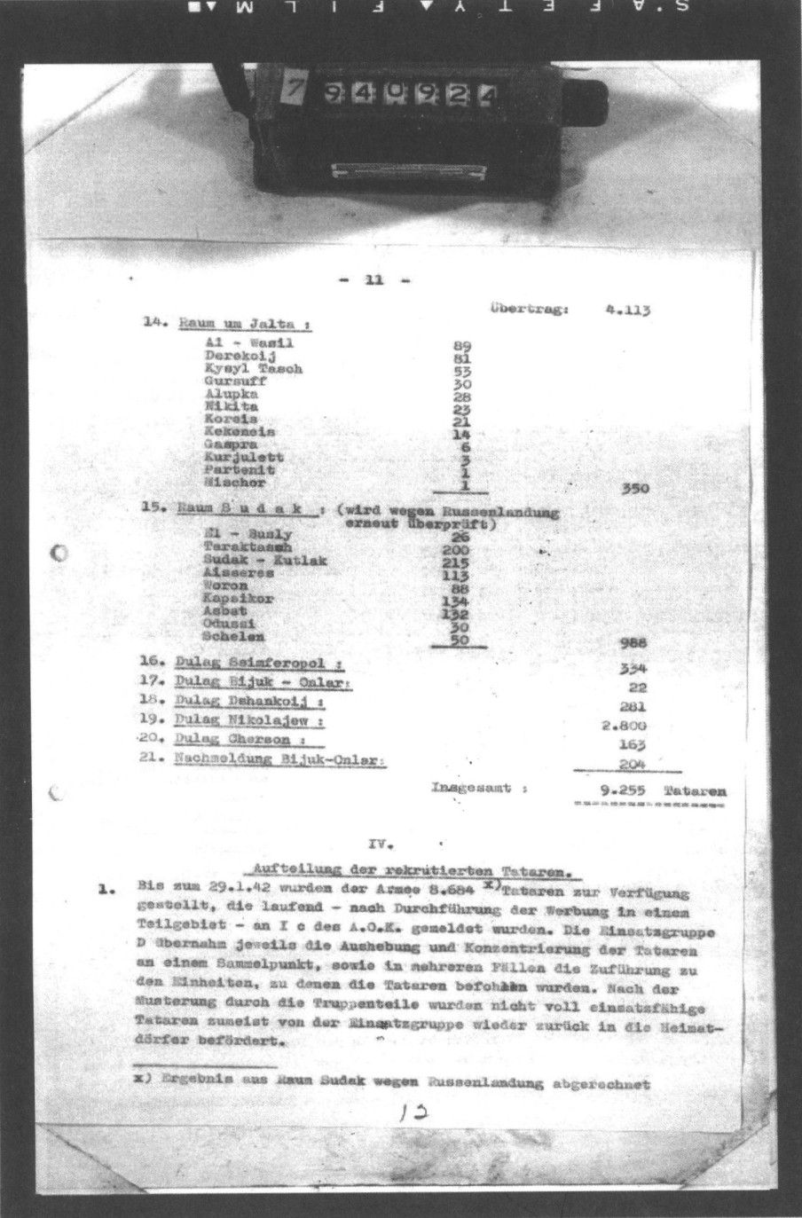 Примечание: В последующие дни посадка самолётов производится во втором районе, а выброска грузов по указанию представителя РО штаба фронта. Расчёт необходимых средств: Указанными выше самолётами до конца сентября м-ца можно сделать 10 рейсов и эвакуировать 320 человек. Для полной эвакуации раненых 580 человек в течение сентября необходимо дополнительно: 2 Дугласа, 1 ТБ-3, 3 С-2. Управление вылетами осуществляет командир 325 ТАП подполковник Овчинников. Командующий 5 воздушной армии генерал-майор авиации Горюнов. Военком 5 воздушной армии бригадный комиссар Грубич. Нач. разведотдела Черноморской группы войск Закфронта подполковник Кочегаров». Фотокопии документовПримечания1. ЦАМО, ф. 215, оп. 1185, д. 120, л. 36; д. 50, л. 117; д. 89, л. 141, 219, 244; д. 118, л. 96 (дано по мере упоминания в таблице). 2. ЦАМО, ф, 20171, оп. 1, д. 7, л. 32, 33, 34, 35, 36, 42, 43. 3. Госархив в АР Крым, ф. П-151, оп. 1, д. 21, Ул. 129—130. Заверенная копия.