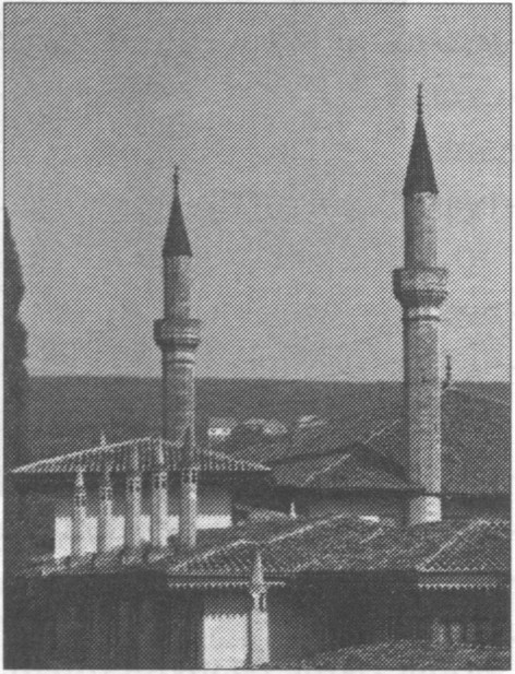 Бахчисарай примечателен своим местоположением. Старый город расположен в глубоком и тесном ущелье по берегам речки Чурук-Су, правого притока Качи. Средневековые памятники соседствуют здесь с провинциальной архитектурой дореволюционной России. Основание Бахчисарая принято относить к концу XV в., некоторые исследователи называют более раннюю дату — конец XIV в. Однако первое упоминание о городе находим в грамоте, датируемой 1502 г. С развалом Золотой Орды бывший наместник золотоордынского властелина в Крыму Хаджи-Гирей в 1443 г. провозгласил себя крымским ханом и объявил об образовании независимого Крымского ханства. Он стал родоначальником династии крымских ханов Гиреев. Свою резиденцию из Солхата (Старый Крым), который прежде являлся центром Крымского юрта Золотой Орды, Хаджи-Гирей перенес в крепость Кырк-Ер (Чуфут-Кале). Затем одно время ханская резиденция была в Салачике (восточная окраина нынешнего Бахчисарая), где сын Хаджи-Гирея Менгли-Гирей построил летний дворец «Ашлама». Рядом с ним в 1501 г. было сооружено монументальное здание Зынджирлы-медресе, мусульманское духовное заведение (здание сохранилось). Однако долина, где стоял дворец, со временем стала тесной, и новый ханский дворец был возведен в соседней, более просторной долине. Старый дворец не сохранился. После присоединения Крыма к России Бахчисарай стал заштатным городком Симферопольского уезда. Бывший ханский дворец, составляющий ныне главную городскую достопримечательность, возведен, как полагают, в начале XVI в., но позднее претерпел множество перестроек и переделок и в нынешнем виде не дает, конечно, представления о дворце тех времен. Средневековый город занимал преимущественно правый, более крутой берег Чурук-Су, на левом, отлогом, возвышался Хан-Сарай — ханский дворец, а на почтительном от него расстоянии — к югу и к северу — можно было увидеть такие же, как и на правом, приземистые, окнами во двор, саманные домишки. Место неподалеку от нынешнего железнодорожного вокзала (эта часть города известна под названием Азис или Азислар) — своего рода заповедник, средоточие мавзолеев. Древнейший из них — мавзолей Бен-Юде-Султан, сооружение которого ученые относят к концу XIV — началу XV вв. Памятник хорошо виден с дороги — слева по пути в новый город; квадратное в плане основание, переходящее в восьмигранник, увенчанный полусферическим куполом (он частично обрушился). Здесь же, через дорогу, три других монументальных надгробия (XV—XVI вв.) и кафедра мечети, принадлежавшей странствующим мусульманским монахам — дервишам. Чем объяснить такое необычное скопление памятников на столь малой площади? Дело в том, что в Средние века, еще до возникновения Бахчисарая, на этом месте существовало довольно крупное татарское селище Эски-Юрт (Старое поселение). Появилось оно не случайно: здесь проходил старый караванный путь — из Херсонеса на север, к Перекопскому перешейку. Местные татары вели оживленную торговлю с проходящими караванами и взимали изрядную пошлину. В непосредственной близости от ханского дворца находится еще один интересный мавзолей. О древности этого памятника говорит само название — Эски-Дюрбе (Старая гробница). Гробница выделяется формой купола (он несколько удлиненный). К мавзолею примыкает открытый квадратный дворик с устроенными в его стенах стрельчатыми а