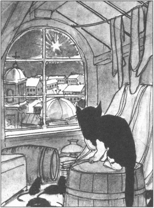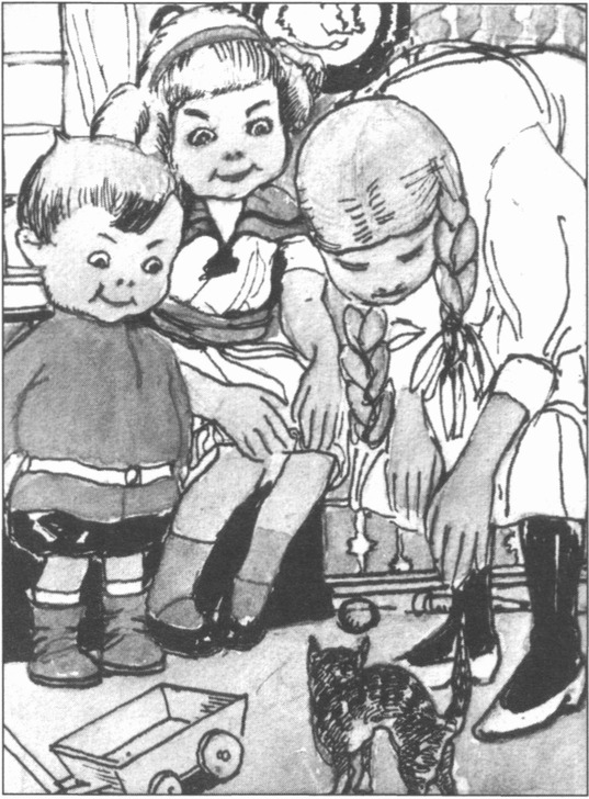 Среди просмотренных книг отдельных изданий «Курнышкина сочельника», «Книжки про Мишку» и «Бутузки» не значилось. Зато выявилась интересная деталь: в 1928 году в московском издательстве Г.Ф. Мириманова у Натальи Манасеиной вышла книжка «Курнышка пропала». Крошечное издание объемом всего двенадцать страниц предназначалось «для самых маленьких». Курнышка в этом незатейливом рассказе уже взрослая кошка, ее воруют, но позже она возвращается. Иллюстрировала книжку художник А. Соборова. Поиск так и не вышедших книжек помог обнаружить сборник, из которого писательница извлекла посланные затем Михаилу Пелопидовича Латри страницы с текстами «Бутузки» и «Курнышкина сочельника». Это — «Рассказы для детей», выпущенные в 1911 году в издательстве журнала «Тропинка». По тексту этого издания и публикуем детский рассказ Натальи Манасеиной. Дмитрий Лосев Курнышка был счастлив. Он попал в кухню полуслепым заморышем с взъерошенной шерсткой и разъезжавшимися лапками, а через месяц его не узнала бы и родная мать. Теперь у него была круглая мордочка, огромные глаза, серая пушистая шкурка, белые лапки и белая грудка. Кухарка любила Курнышку, досыта кормила печенкой и позволяла спать на своей высокой постели, застланной пестрым одеялом, с горой подушек в изголовье. Отлично жилось Курнышке, но, по природе, он был любознателен. Кухня надоела котенку, и захотелось ему посмотреть на что-нибудь новое. В кухне были две двери. Одна вела в комнаты, другая на черную лестницу. Курнышка долго сидел на полу посредине кухни. Подогнув лапки и щурясь, поглядывал он на двери, соображая, которая лучше. Дверь на лестницу чаще стояла открытой и была потому удобней, но площадка перед ней была всегда такая мокрая и грязная, что Курнышка, при одной мысли ступить туда, только дальше прятал белые лапки. Припомнил он и дворника, человека большого и страшного. Курнышка боялся топота его тяжёлых ног, а главное, огромной вязанки, которую он с грохотом сбрасывал на пол. Завидев дворника, котёнок со всех ног мчался на высокую кровать. Нет, положительно, он не хотел встречаться с дворником! Вот почему выбор его остановился на второй двери. Теперь оставалось только воспользоваться удобным случаем, и потому, когда няня, позавтракав, собралась уходить из кухни, Курнышка прошмыгнул за нею. В детской неожиданное появление котёнка было встречено с восторгом. Десятилетняя Нина, худенькая и подвижная, с темной косой, болтавшейся, как маятник кухонных часов, и семилетняя Маня — кругленькая и румяная, как булочка, которые часто пекла кухарка, обе сразу, в один голос, решили, что такого котёнка на всём свете нет. Трехлетний толстяк Миша ничего не сказал, потому что говорил вообще плохо, но всей своей фигурой выразил восхищение. Мама и няня к красоте Курнышки отнеслись довольно равнодушно. Их больше интересовал его характер. Когда же выяснилось, что Курнышка не царапается, даже в тех случаях, когда его тащат за хвост, мама и няня решили, что котенка можно оставить в детской. С этого дня житье Курнышки стало еще лучше. Спал он по-прежнему в кухне и по утрам, как всегда, ел печенку, но как только няня приходила за молоком, он отправлялся вместе с ней в детскую. Шумный восторг, с которым встречалось его появление, льстил самолюбию котенка. Он видел, что его ценят, и давал вдоволь любоваться собой, выгибал пу