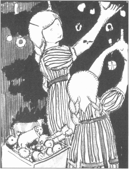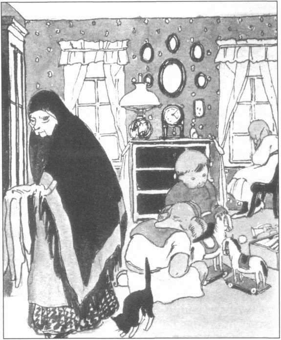 Приступая к работе, художник, несомненно, обратил внимание на адресованные ему краткие пожелания заказчицы, высказанные в написанных ею от руки записках, помещенных в начале и конце рассказа. Одно из них: «Чтобы книга вышла рождественской, с елкой, звездами...» В атмосферу праздника вводит уже эскиз обложки, где на оливковом фоне помещен ярко-синий силуэт елки с игрушками и горящими свечами. Внизу — изображение котенка с выгнутой спинкой, поднятым хвостом и широко расставленными лапами. Поза Курнышки очень живая и выразительная, в ней чувствуется испуг животного перед большим и непонятным предметом. Помимо цветных иллюстраций, художник выполнил ряд черно-белых. В том числе — буквицу с рисунком сидящего котенка. Черной тушью Латри нарисовал дворника с вязанкой дров на плечах — «человека большого и страшного» с точки зрения маленького Курнышки. «Хотелось бы соединения детских фигур с котенком», — писала в записке Манасеина. Откликаясь на это пожелание, художник выбрал для одной из иллюстраций момент прихода Курнышки в детскую. На лицах двух младших детей изумление и неподдельное восхищение. Технические приемы, которыми пользуется Латри, обычны для того времени. Каждый изображенный предмет имеет четко очерченный контур, придающий цветным изображениям четкость и осмысленность. Контур заполнен ровным плотным пятном цветной гуаши. Но несмотря на такое, казалось бы, незатейливое исполнение, рисунки отличаются красотой и гармонией цветовых сочетаний. Как пример — иллюстрация с двумя девочками, украшающими елку. Их фигуры в полосатых платьях (белых с голубым) живописно выделяются на фоне черной ели. Ритмическое чередование белых рук, лиц, охристых волос говорит о тонком вкусе художника, прекрасного мастера колорита. Наталья Манасеина считала, что в иллюстрациях желательно избежать изображений взрослых. «Разве только нянюшку. Без нянюшки нельзя», — писала она, отводя тем самым очень важную роль этому персонажу. Сгорбленная фигура хлопотливой нянюшки в черном платке четко выделяется на ярко-розовом фоне стены детской. Глядя на иллюстрацию, мы словно слышим шарканье ног старушки. Одна из лучших иллюстраций Латри к рассказу «Курнышкин сочельник» изображает оставленного на чердаке в рождественскую ночь котенка. «Из чердачного окна с потемневшего неба прямо на него смотрела звезда... В первый раз в жизни увидел Курнышка звезду. Он долго смотрел на нее, вытянув шею и широко раскрыв глаза, а кругом, где-то совсем близко, гудели колокола...» Выполненная в неяркой серо-голубой с черным и белым цветовой гамме иллюстрация отмечена не только выразительностью, но и поэтичностью. Помимо рассказа «Курнышкин сочельник» Михаил Латри сделал иллюстрации и к другим произведениям Н. Манасеиной, которым также не суждено было стать отдельными изданиями. Пятьдесят четыре рисунка к «Книжке о Мишке» и двадцать два — к «Бутузке» хранятся в фондах Феодосийской картинной галереи им. И.К. Айвазовского. Иллюстрации Михаила Пелопидовича Латри к рассказам Натальи Манасеиной окрашены теплыми воспоминаниями художника о светлых, безмятежных годах детства, с которыми человек не расстается всю жизнь. Ирина Погребецкая. Библиографический комментарийКогда главный хранитель галереи Айвазовского предложила этот материал для «Крымского альбома», возникло