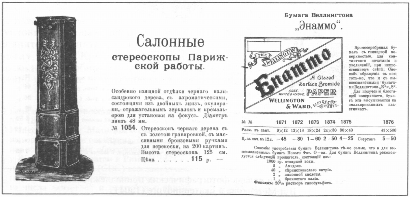 Среди прочих изданий особого внимания заслуживает «Иллюстрированный прейскурант склада фотографических принадлежностей В.Л. Метенкова в Екатеринбурге», изданный в 1904 году. Будучи сам фотографом, автор каталога не ограничивается исключительно рекламой товара. Он дает различные советы начинающим фотографам, ненавязчиво наставляя и инструктируя их в вопросах работы с фотографической техникой. Наряду с изобретениями Болдырева и Полякова (фотокамера с автоматическим регулированием экспозиции) внимание фотографов рубежа XIX—XX веков привлек и стереоскопический аппарат Д. Езучевского10. Вообще, стереоскопические снимки — это всегда особая тема. Появились они в Англии в 1840-х годах благодаря сэру Чарльзу Уитсону11. Широкую популярность получили после Всемирной выставки 1851 года в Хрустальном дворце. Принцип действия подобного устройства таков: съемка осуществляется при помощи двойного объектива, тем самым получаются небольшие изображения (как правило, 10×10), снятые под небольшими различными углами. Смотреть на такие снимки полагается через специальный прибор — стереоскоп. Наибольшей популярностью пользовалась форма стереоскопа, придуманная Дэвидом Брюстером12 в 1850-х и напоминающая своим корпусом пирамиду. Затем в обиход вошли более простые прямоугольные формы. Ощущение глубины, трехмерности изображенных предметов и, наконец, создаваемая иллюзия «моментальности» придавали стереоскопическим снимкам особую, дополнительную выразительность и, по мнению многих, более точную, по сравнению с обычными фотографиями, приближенность к действительности. Стереоскоп в свою очередь позволял детально и внимательно рассмотреть самые незначительные детали. В России начала века фотографы часто применяли в работе аппараты фирмы «Е. Краус» и «Эмиль Буш». Аппараты «Е. Краус» были портативными, вдобавок они имели моментальные затворы и полуавтоматические кассеты для смены пластинок.