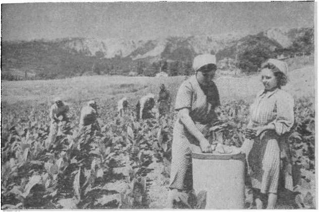 В Симферополе и Ялте имеются фабрики искусственной ферментации табака. Предгорная и степная части дают сырье для симферопольской фабрики. Южный берег, в котором сосредоточено около половины площади, занятой под табаком в области, обеспечивает сырьем фабрику в Ялте и другие табачные предприятия Крыма. Продукция табачной промышленности Крыма составляет значительный удельный вес в продукции табачной промышленности СССР, особенно по высшим сортам табака. В ближайшие годы задачей табачной промышленности Крыма является не только количественное увеличение производства, но и улучшение качества и расширение ассортимента продукции. Субтропические культуры. Южное побережье Крыма по своим климатическим условиям особенно благоприятно для разведения сельскохозяйственных культур сухих субтропиков: маслины, инжира, хурмы, граната, фисташки, миндаля и других. Они разводились здесь в очень ограниченных размерах «в дореволюционный период. В годы пятилеток насаждения этих культур значительно возросли. Далеко за пределами области заслуженной славой пользуются крымские табаки. На снимке — сбор табака в колхозе им. Калинина. Как показал опыт, на Южном берегу Крыма возможно возделывание и цитрусовых культур. Весной в 1949 г. на Южном берегу были произведены посадки лимонов и мандаринов. Насаждения были размещены главным образом в парках южнобережных здравниц, а также в колхозах и совхозах. В 1952 г. был получен первый урожай цитрусовых. Например, в Алуштинском районе («Рабочий уголок») и в парках здравниц Ялты с растений в траншеях (в Крыму возможна пока лишь траншейная культура цитрусовых) снято несколько тысяч лимонов сорта «Новогрузинский». На Южном берегу Крыма были проведены посадки эвкалипта27. Эвкалипт выдерживает температуру лишь до 12—13° мороза. Это пока затрудняет его посадку в более северных районах. В настоящее время советскими селекционерами выводятся морозоустойчивые и засухоустойчивые сорта эвкалиптов; некоторые из них переносят температуру до 15° мороза. Культура ворсянки. Природные условия Крымского полуострова благоприятствуют разведению здесь теплолюбивой культуры ворсянки28, она дает ворсовальную шишку, применяемую в текстильном производстве для получения ворса на тканях29. В течение многих лет основным поставщиком ворсовальной шишки на мировой рынок была Франция. В нашей стране до революции ворсянка выращивалась лишь на незначительных площадях в Бессарабии и Крыму, и Россия была вынуждена ввозить ворсовальную шишку из-за границы. В промышленных целях возделывание ворсянки в Советском Союзе (в Крыму и Казахстане) началось в 1925 году. В результате значительного увеличения посевных площадей и повышения урожайности к концу третьей пятилетки наша страна полностью обеспечила свою промышленность ворсовальной шишкой, освободившись от необходимости ее импорта. Ворсянка возделывается в основном в предгорных районах области (Бахчисарайский, Белогорский, Зуйский, Симферопольский и Старо-Крымский), а также и в степных районах (Нижнегорский, Советский и Кировский). Крымские колхозники стали мастерами высоких урожаев, снимая до 3 и более центнеров ворсовальной шишки с гектара. В ближайшее время посевы этой высокодоходной культуры в Крыму будут расширены. Животноводство. В дореволюционное время в Крыму преобладало п