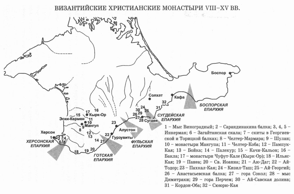 Однако период относительной стабильности оказался непродолжительным. Уже в XII в. арабский географ Идриси упоминает, что путь от Херсона до Ялиты лежит в стране «куман», и население платило половцам дань132. Как отмечает в упомянутой монографии Ю.М. Могаричев133, до XIII-XIV вв. пещерные монастыри в Горном Крыму также не получили широкого распространения134, и строительство большинства из них совпадает с возникновением княжества Феодоро. К ним он относит монастыри Челтер-Коба (XIV-XV вв. —?), Челтер-Мармара (XII-XIII вв.), Шулдан (XIII—XIV вв.), часть монастырских комплексов Инкермана (XIV-XV вв.), Успенский монастырь, четыре комплекса на Мангупе135, монастырь в районе южных ворот Чуфут-Кале и скит с храмом «Донаторов» близ Эски-Кермена. Сомнителен, с нашей точки зрения, тезис о том, что развитию монастырей в Горной Таврике способствовали политическая и экономическая ситуации. Если вторжение сельджуков в 1222 г. и татаро-монголов под предводительством темников Джебе и Субедея в 1223 г. затронуло только Восточный Крым, то со второй половины XIII в. татары совершали набеги не только в юго-восточные районы, но и в юго-западные. Междоусобные конфликты в Золотой Орде привели к известному набегу в 1299 г. темника Ногая, разорившего многие города и поселения полуострова. В это же время в прибрежных районах активизировалась борьба генуэзцев с княжеством Феодоро. Даже перечисленные события явно противоречат тезису о политической стабильности. Конечно, нельзя представлять жизнь местного населения как бесконечное участие в войнах. Были, бесспорно, и длительные периоды относительного затишья. Касаясь причин концентрации монастырей на территории Южного и Горного Крыма, в первую очередь надо отметить: доминирующее христианское вероисповедание среди населения; малодоступность данного региона и его естественную защищенность от набегов кочевников; активное развитие феодальных отношений, что позволяло получать поддержку от местных владетелей; возможность в отдельных долинах иметь существенную земельную собственность. Кроме того, в поздний период монастыри концентрировались в пределах государства Феодоро, князья и население которого традиционно придерживались православного вероисповедания, что на фоне язычества, активного утверждения ислама, а в генуэзских колониях — влияния римской церкви имело решающее значение. Надо отметить, что в Крыму имелся еще один регион концентрации православных монастырей с центром в Судаке. Христианство, доминировавшее здесь еще с периода иконоборчества, не утратило своего влияния и в X-XIV вв. В Восточном Крыму вторжение волн кочевников, бесспорно, оказывало серьезное влияние на этнический состав населения, и, кроме того, здесь византийские позиции не были настолько сильны, как в Херсоне. Но в то же время развитие крупного торгового центра средневековья, связывающего страны Средиземноморья с кочевыми народами Северного Причерноморья, Средней Азией и Русью, предоставление Византией льготных условий для торговли Генуе согласно договору 1169 г. способствовали не только интенсивному развитию этого региона, но и распространению христианства. К сожалению, в отличие от Южного и Юго-Западного Крыма этот регион слабо исследован в археологическом отношении, однако даже имеющиеся сведения говорят о наличии здесь мощного религиозного цент
