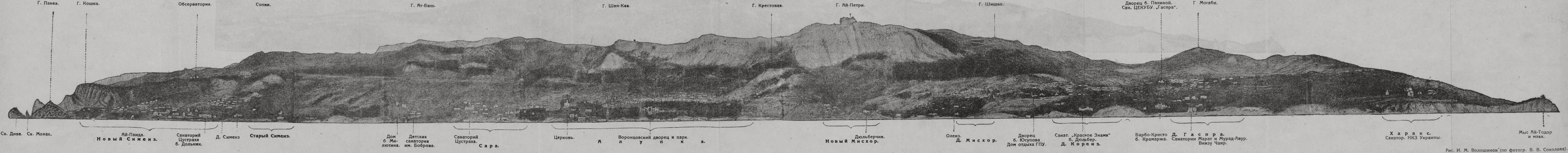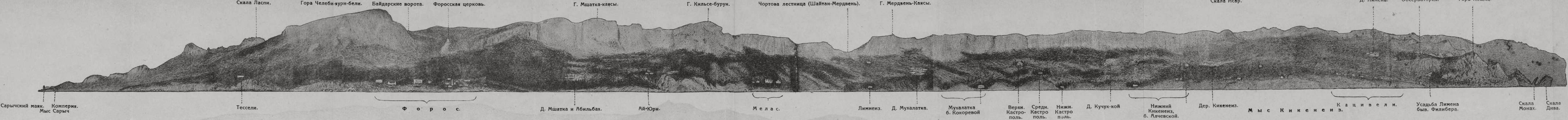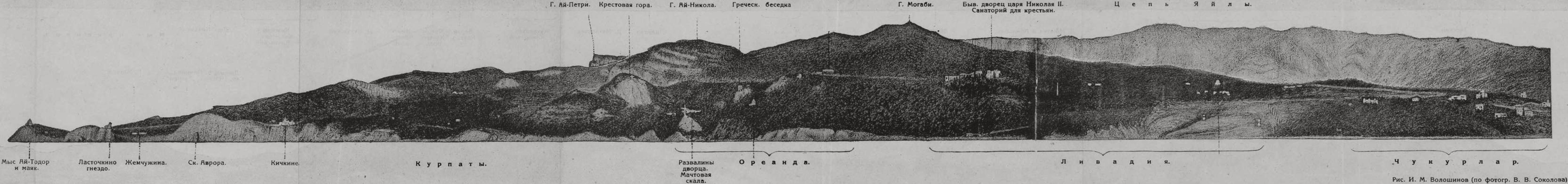 13. От Севастополя до Ялты моремОт Севастополя до Ялты морем — около 85 км. Пароход идет 5 часов. Пароход из Южной бухты выходит на Севастопольский рейд, имея с правой стороны Павловский мысок с обсерваторией и магнитно-компасной станцией (башня с куполом) а с левой — пристань III Интернационала с колоннадой, городской театр, купальни, пристань Яхт-клуба, парапет у начала пловучего моста времен Крымской войны. Вдали над городом виднеется куполообразное здание Панорамы обороны Севастополя. Хорошо виден также Владимирский собор. Выйдя на рейд, пароход поворачивает на запад: справа батареи, слева — Приморский бульвар, против которого на камне, выступившем из воды, — памятник в виде колонны в память затопленных в 1854—55 гг. кораблей (линия затопления идет от Приморского бульвара поперек рейда к Михайловской батарее): на северной стороне рейда — Братское кладбище, все в зелени, с пирамидальной церковью. За бульваром видны здания Севастопольского Яхт-клуба (здание — в восточном стиле) и рядом — Биологической станции Академии Наук (белое двухэтажное здание у самого берега), еще дальше — красивое здание Сеченовского института физических методов лечения. На мысу между этой бухтой и следующей б. Херсонесский монастырь и развалины древнего Херсонеса. Далее идет Стрелецкая бухта, за Стрелецкой бухтой видны по берегу дачи, почти совершенно лишенные зелени, а дальше в последовательном порядке идут Песчаная или Круглая, Камышовая и Казачья или Двойная бухты (в двух последних в 1854—55 гг. стоял англо-французский флот). Берег у Казачьей бухты понижается почти в уровень с водою и выступает в море плоским носом. Здесь у самого берега стоит Херсонесский маяк (высота его 30 м). За маяком пароход круто поворачивает на юго-восток и идет вдоль берега, сначала плоского, а затем постепенно повышающегося. Вдали видна цепь Крымских гор. Впереди вырисовывается круто обрывающийся в море мыс Фиолент. Вообще интересные особенности геологического строения местности обращают на себя внимание с моря. Верхняя часть обрыва сложена из известняков (светлых) сарматского яруса. Ниже идет темная полоса, состоящая в верхней своей части из трахитового конгломерата, а ниже из кварцевого трахита. Из трахита же сложены и отдельные скалы, выступающие в море. Не доходя мыса, на крутой возвышенности виднеются развалины дач. Это бывший курорт Александриада или Джаншиев поселок, названный по имени известного публициста Г.А. Джаншиева. Его же именем назван скалистый темного цвета мыс, в котором природой сделаны широкие ворота, известные под именем грота Дианы. В эти ворота может свободно пройти большой баркас. Перед Фиолентом, примыкая к нему, выступает из моря остроконечная высокая скала кристаллического строения. Восточнее Фиолента выдается из воды много камней разнообразной формы. От Фиолента пароход, направляясь к виднеющемуся впереди еще более высокому мысу Айя, постепенно отдаляется от берега. По пути виден б. Георгиевский монастырь с остроконечной колокольней; далее — крутая Мраморная балка, а еще дальше, минуя ряд красноватых утесов, на трехгранном холме виднеется круглая башня (остатки генуэзских укреплений). Левее этой горы, у ее основания, — вход в Балаклавскую бухту (самого города не видно, в бинокль можно рассмотреть только несколько построек). Здесь пароход идет 