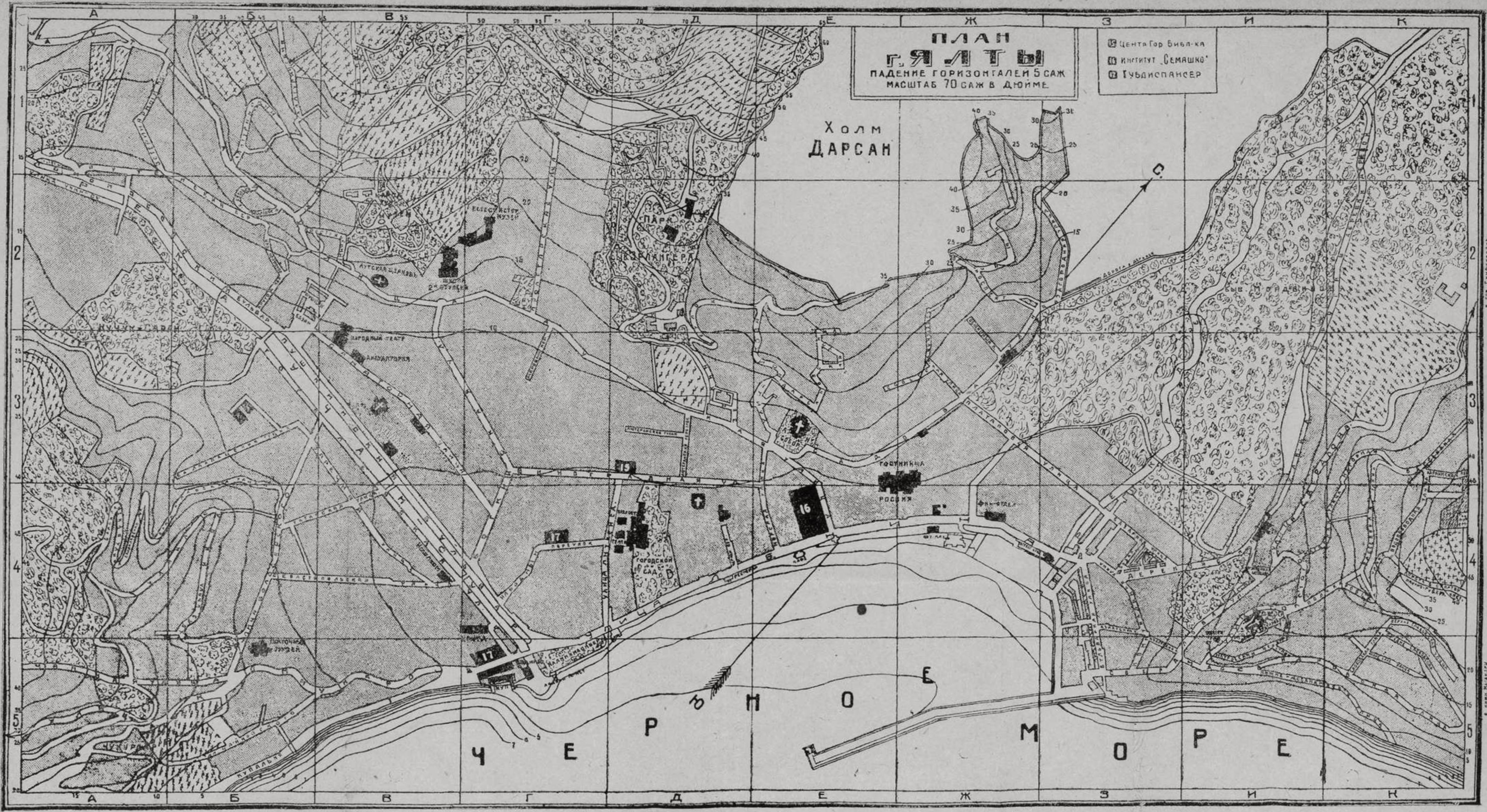 Прошлое Ялты. Время возникновения Ялты точно неизвестно. Самое название Ялта, по-гречески Ялита (от греческого ялос — берег), показывает, что основана она была, вероятно, греками. В XI в. Южный берег подвергся нападению половцев. К этому времени относится самое раннее свидетельство о Ялте. Арабский географ Ибн Эдризи, живший в Сицилии в XII веке, пишет о черноморском побережьи: «от Корсуни до Джалиты (Ялта) в стране куманов (половцев) — 30 миль, от Джалиты до Гарзуни (Гурзуфа), цветущего приморского города, — 12 миль». (1154 г.). В XIII веке Крым попадает под власть татар, которые утверждаются в степной его части. Все селения Южного берега были заняты генуэзцами, имевшими здесь свои многочисленные фактории. В церковном отношении Ялта была подчинена Константинопольскому патриархату. В 1371 и 1384 гг. в документах упомянуто о существовании патриаршего владения по имени Ялиты (Гиалита), которое было поручено ведению Сугдейского (Судакского) митрополита. На итальянских картах XIV века Ялта называется Каллита, Гиалита, Эталита. В XV веке Ялта переходит в руки турок и попадает в состав мангупского кандалыка. По свидетельству Сумарокова, «Ялта всегда оставалась значущим укрепленным местом» как у греков, генуэзцев, так и впоследствии у турок. Христиане бежали в горы от преследования турок и в пещерах собирались для общей молитвы. Может быть, около Ялты такой пещерой была пещера Иограф (по Узенбашской тропе). Часть населения была обращена в магометанство и слилась с татарами. С усилением России власть и значение Турции в Крыму мало-помалу падает. Последним представителем турецкой власти в Ялте был гонитель христиан Хаджи-Ахмет Ага. Еще большею жестокостью отличались его жена Хаджава и сын, носивший прозвище Дели-Балта, т. е. бешеный топор. После первой турецкой войны из Ялты в 1778 году было выселено в Россию почти все христианское население (греки)2, не взирая на протесты татар и самих христиан. Ялта почти перестала существовать. Дюбуа де-Монпере еще в 30-х годах XIX века видел развалины церкви св. Иоанна на холме близ моря, немного ниже теперешнего собора. Об этих же развалинах, лежавших «у оконечности мыса у моря», сообщает Паллас, что здесь была церковь, случайно взорванная порохом во время первой русско-турецкой войны. По словам Сумарокова, в этой церкви была предательски умерщвлена горсть русских, сдавшихся на слово туркам, напавшим на Ялту уже по заключении Кучук-Кайнарджийского мира. После второй турецкой кампании Крым был присоединен к России. Татары упорно не хотели подчиниться новым порядкам, и для устрашения их были переселены из Керчи и Еникале архипелажские греки. В 1800 году, по словам Сумарокова, насчитывалось 13 избушек греческого Балаклавского батальона. Тогда же вновь была заселена деревня Аутка. По вызову кн. Воронцова здесь было поселено несколько греческих семейств (вернувшихся из Мариупольского уезда), занявшихся промыслом — ловлей устриц. Впоследствии они были причислены к албанскому войску (Балаклавский батальон) и смешались с этими новыми обитателями Крыма. Южный берег начал возрождаться в 20-х годах XIX в., и Ялта оказалась окруженною благоустроенными имениями. Как естественный центр она была сделана уездным городом 17 сентября 1837 года. В том же году Ялта была соединена шоссе с Севастополем, и был выстроен первоначальный ялтинский мол, кот