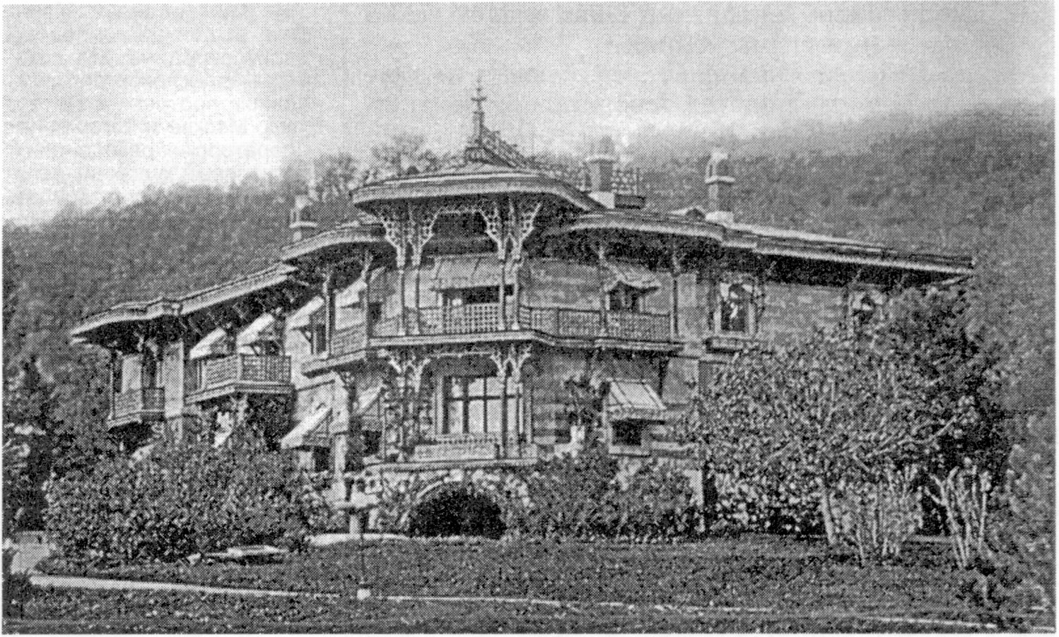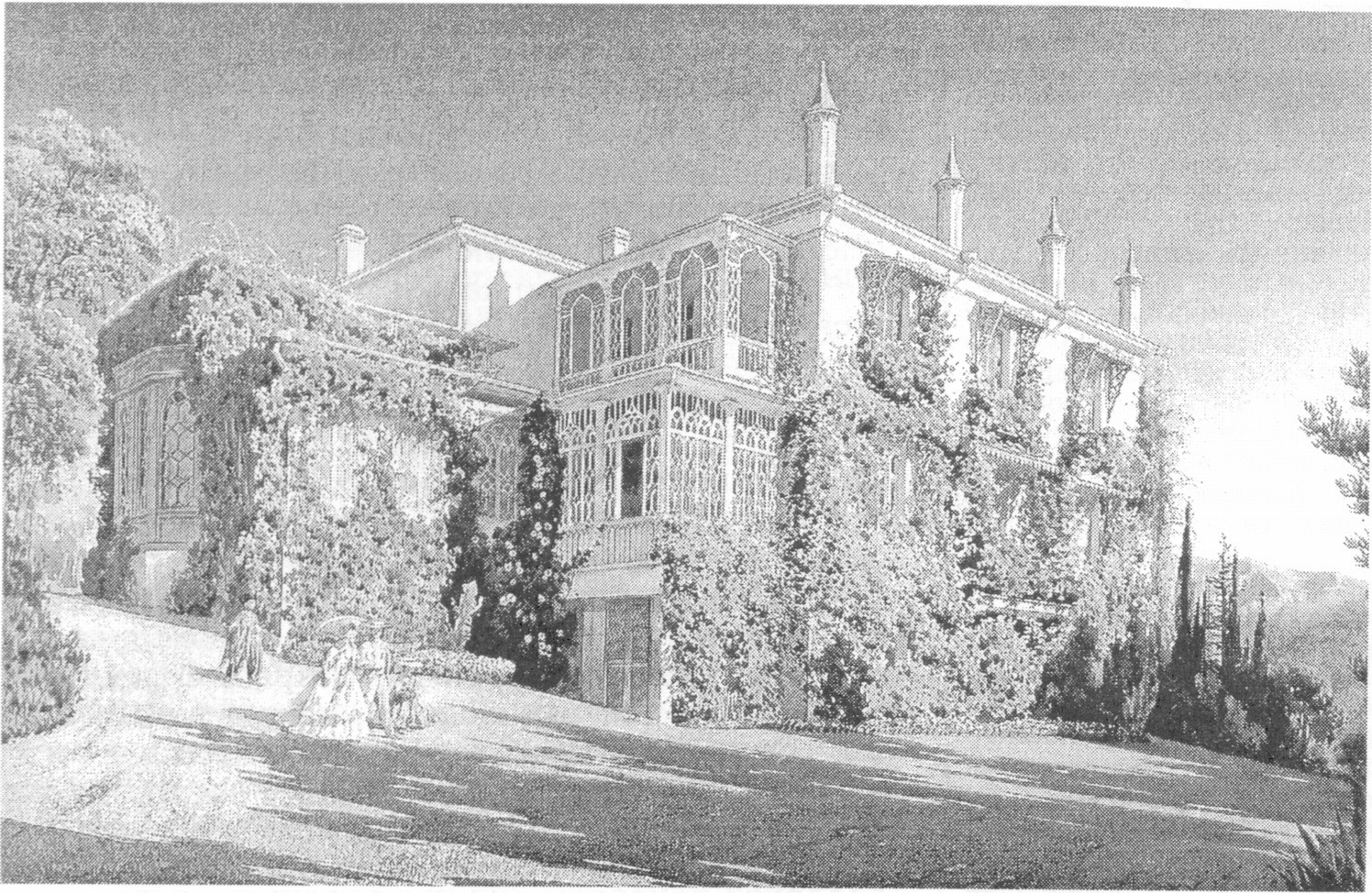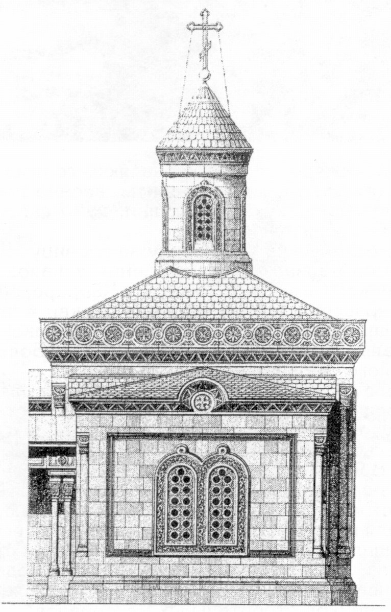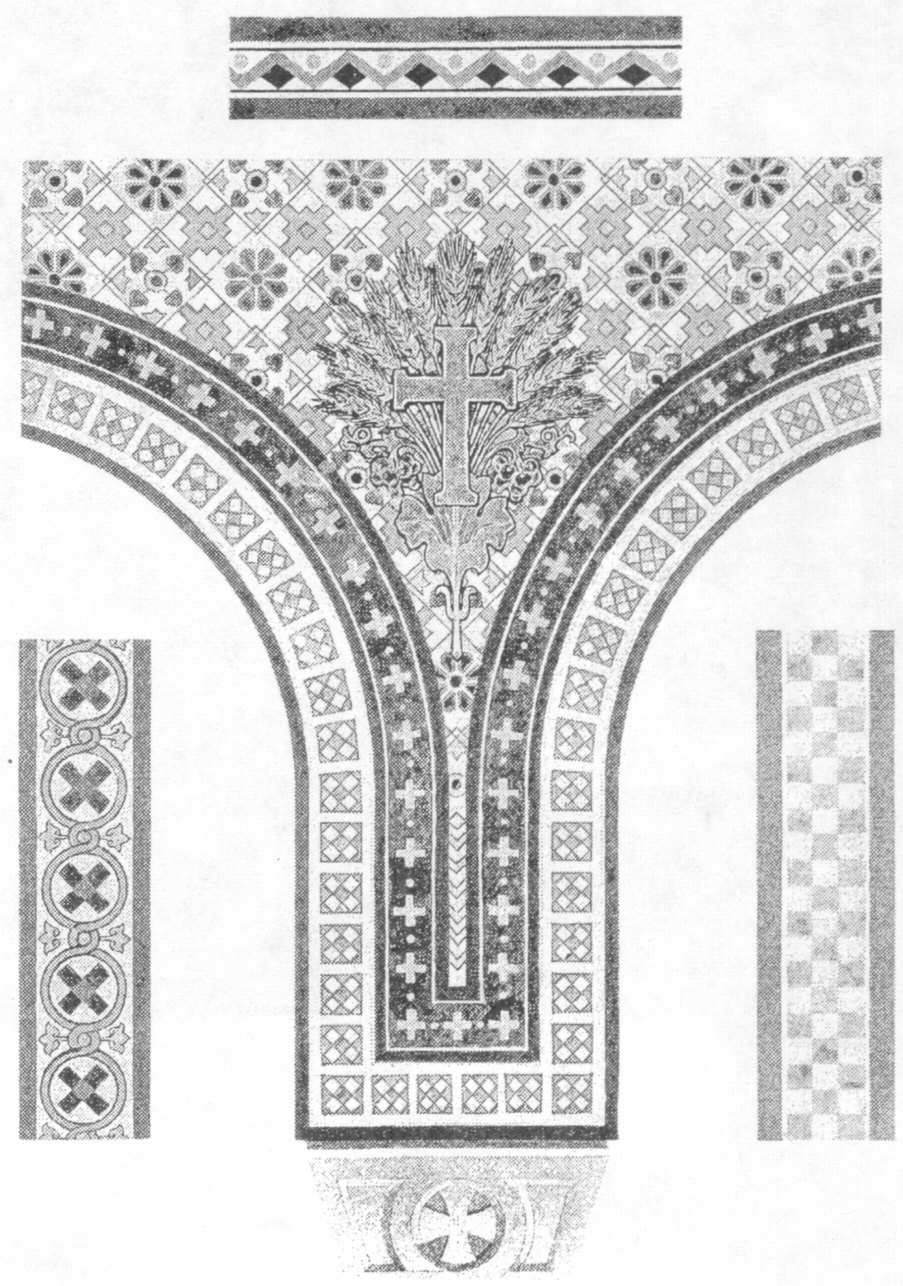 Архитектурный стиль, предложенный зодчим для ансамбля дворцовых зданий, нашел полное одобрение Марии Александровны: своей простотой и утонченной изысканностью он отвечал всем ее требованиям. Впоследствии в отчетах о строительных работах Ипполит Антонович постоянно подчеркивал, что большинство зданий выполнено им в «татарском вкусе» или «во вкусе татарской избы»11. Проект же дворцовой Крестовоздвиженской церкви12 основывался на синтезе архитектуры культовых сооружений Закавказья и Византии. Свободная, живописная компоновка построек дала возможность архитектору каждую из них решать своеобразно, с включением каких-либо иных, отличных от соседней, мотивов, сохраняя при этом единый созданный им стиль. Четыре года жизни, полностью отданных строительству в имении Ее Величества «Ливадия», отмечены огромным напряжением всех сил выдающегося художника. Отдаленность от России, от основных поставщиков, сложности с доставкой строительных материалов и подбором рабочей силы в тогда еще малолюдном Крыму, — дали о себе знать уже в начале строительства. Лето 1862 года ушло на энергичную организацию строительных работ: заготовку и доставку камня, кирпича, черепицы, древесины, наем рабочих. Наконец, 8 сентября торжественно отметили закладку фундаментов церкви и дома для великих князей (Малого дворца), а с октября начались перестройка дома Потоцкого в Большой дворец, старой оранжереи и дома управляющего имением и строительство домов для свиты, военно-походной канцелярии, кухни, конюшни, дома садовника, бани и госпиталя.