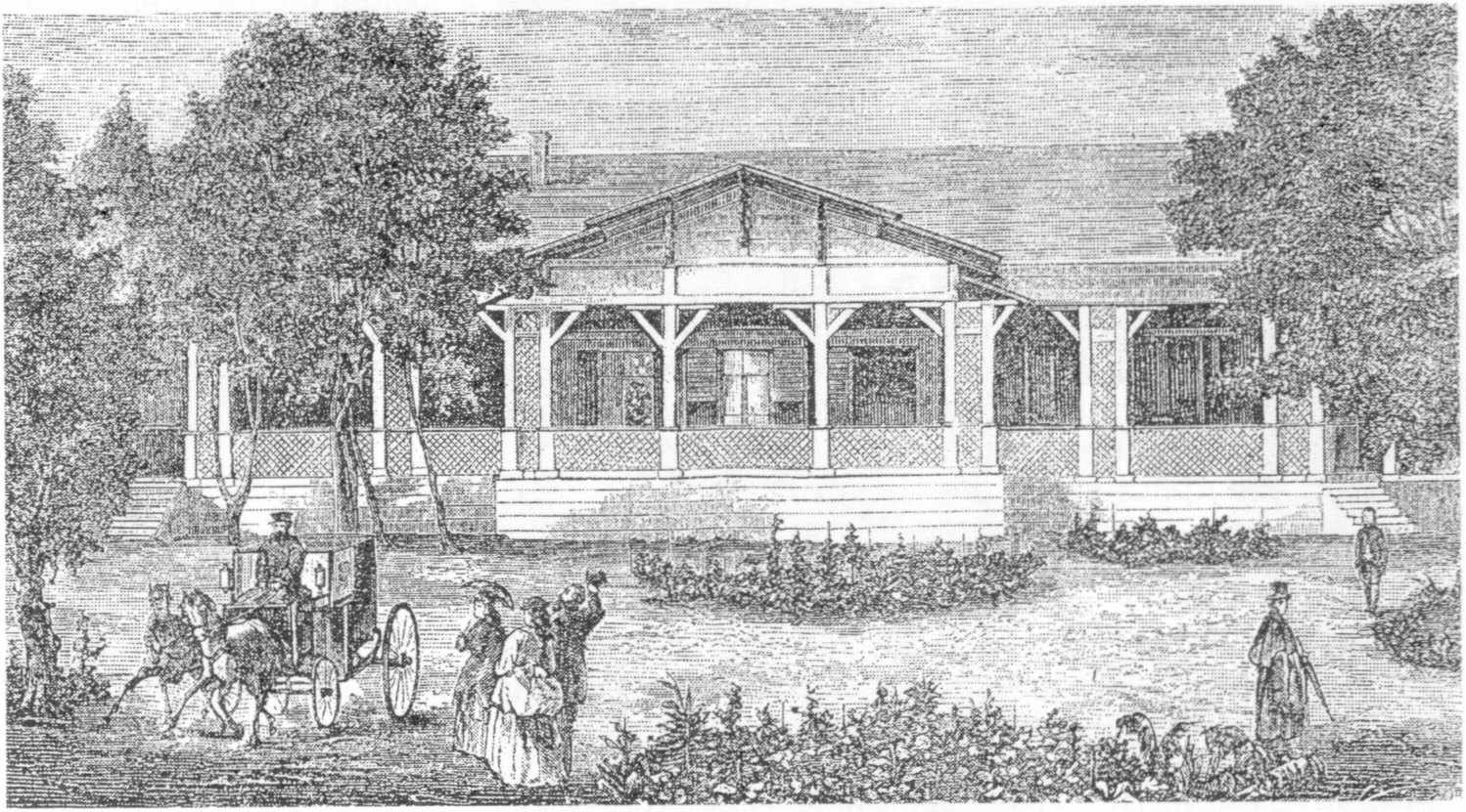 Оставил нам свое восприятие Ливадии 1863 года и приехавший по приглашению императорской семьи австрийский художник Р. фон Альт. На двадцати очаровательных акварелях, написанных им за время пребывания в царском имении, запечатлены все основные постройки Монигетти и несколько уголков парка. Художнику удалось передать не только цветовую гамму построек Ливадии, но и их тончайшие архитектурные детали. Жилые и большинство хозяйственных зданий, возведенных из местного камня, имели гладкие, ровные стены — либо простой полигональной кладки, сохранявшие естественный цвет гаспринского камня, либо оштукатуренные в светло-коричневые тона. Главным украшением всех построек были резные элементы из дерева: стрехи крыш («сталактиты»), карнизы и подпирающие их кронштейны, колонки балконов, решетки, пинакли14. На их фоне ослепительной белизной сверкал дворцовый храм, возведенный из инкерманского камня, с византийской орнаментацией по этому камню и резными вставками из гаспринского. Высочайший приезд 1863 года оправдал уверенность И.А. Монигетти в том, что его труд будет по достоинству оценен владельцами имения. «Ея Императорское Величество, — писал он, — по-видимому была поражена успехом и исполнением работ и благодарила меня в самых лестных выражениях. Государь Император <...> по осмотре работ изволил поблагодарить меня словами: «Все, что сделано до сих пор, сделано превосходно, надеюсь, что такое же будет и окончание».