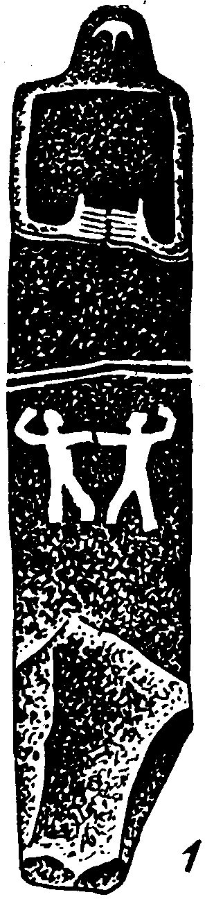 Идолы и святилищаВсе началось, как это часто бывает в науке, со случайного открытия. В Бахчисарайском районе, у села Казанки, трактористы нашли большую вытянуто-прямоугольную стелу. Присмотревшись повнимательнее, поняли, что это — очень грубое, примитивное изображение человека. Голова, нос, глаза, сложенные на груди руки, над ними — поясок, а ниже — две рельефные человеческие фигурки. На стеле были тщательно проработаны плечи, спина, талия. О своей находке трактористы немедленно сообщили в Бахчисарайский историко-археологический музей. Могли ли они думать, что, впервые столкнувшись с археологией, оказали ей неоценимую услугу, что об их находке скоро станет известно далеко за пределами нашей страны, что она выдвинет перед специалистами новую тему исследований, затронет сложные вопросы происхождения искусства, религии, культурных взаимосвязей древних племен? Увы, не подозревали этого и сами ученые, которым она попала в руки. Оживленные споры среди специалистов, дискуссии, которые продолжаются еще и сегодня, были тогда впереди1. Итак, находка стелы близ села Казанки. Год 1956-й. А ровно через 10 лет у Бахчисарая, в 12 километрах от села Казанки, человеком, также далеким от археологии, была найдена вторая подобная стела. Поразительное сходство с первой: те же пропорции, та же техника изготовления, тот же стиль, тот же сюжет. Для археологов это была удача, о которой никто не мог и мечтать... Две стелы, как две сестры, очевидно, выполнены одним мастером, жившим около четырех тысяч лет назад.