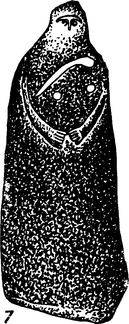 Следует отметить, что в степях Северного Причерноморья антропоморфных стел эпохи энеолита и ранней бронзы найдено довольно много. Из них несколько — еще до революции, но основная масса — уже в советское время и, главным образом, после Великой Отечественной войны. Однако пристальное внимание исследователей они привлекли лишь после того, как появилась публикация о стеле из села Казанки. Картографирование найденных на территории нашей страны антропоморфных стел III — начала II тысячелетия до н. э. показало, что они сосредоточены в основном на крайнем юге европейской части СССР. По своему внешнему облику они делятся на несколько групп: 1) очень примитивные, в виде вытянутого, слегка обработанного камня, на котором небольшим выступом выражены голова и плечи; 2) столь же примитивные, но с выделенными руками, глазами, носом и некоторыми другими деталями; 3) стелы, аналогичные найденным около Бахчисарая, — большие хорошо обработанные плиты вытянутых пропорций. Это уже не уплощенные «односторонние» стелы, а скорее объемные статуи. Помимо головы и рук, у них выделена спина, лопатки, поясница, живот, лицо. Кроме того, они, как правило, несут на себе дополнительные изображения: детали одежды, оружия (посох, топоры, лук), украшения, порою даже рельефные фигурки людей и животных. Существенно отметить одну деталь, общую для всех стел рассматриваемого круга, — отсутствие ног. Лишь на нескольких из них на плоской стороне имеется изображение ступней. Стелы первой и второй групп часто служили перекрытием погребений, совершенных под насыпями курганов в грунтовых могилах. Стелы третьей группы устанавливались на вершинах курганов, над могилой погребенного. Эти мрачноватые каменные идолы поставили перед учеными ряд сложных, еще и доныне не решенных задач. Прежде всего возник вопрос: к какому времени они относятся и каким племенам принадлежат? Было высказано несколько предположений. Сначала их считали киммерийскими. Затем было установлено, что они относятся к эпохе ранней бронзы и, таким образом, никак не «моложе» 4—4,5 тысячи лет. Сейчас ряд ученых связывает их с так называемой ямной культурой, племена которой в конце III тысячелетия до н. э. проникли в степи Украины с территории Нижнего Поволжья. Но, оказывается, в Поволжье, этой классической «стране» ямной культуры, несмотря на многочисленные раскопки, ни одной такой стелы неизвестно. Это веский аргумент в пользу тех исследователей, которые считают, что стелы принадлежат местному кеми-обинскому населению Северного Причерноморья2.