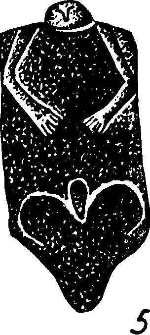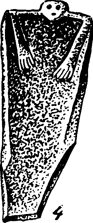 Окончательное решение всех этих вопросов принадлежит будущему. Сейчас нам остается добавить, что в отдельных деталях стел юга Украины, в особенности бахчисарайских, есть много общих черт со статуями из Франции: типичное Т-образное изображение носа и глаз, фигурки людей, помещаемые внизу, ступни ног, топоры и другие детали. Некоторую общность с ними обнаруживает также ряд памятников Скандинавии и Румынии4. Что это — случайное совпадение, указание на какие-то связи искусства Северного Причерноморья и Западной Европы, результат передвижения племен?.. Быть может, прав А.А. Формозов, полагающий, что «образ человека вошел в монументальное искусство энеолита Франции и южной России не без влияния древнейших цивилизаций Востока»5. Ведь именно там, прежде всего в дельте Нила, еще в IV тысячелетии до н. э. закончило свое существование первобытное равенство, выделилась правящая верхушка — фараоны и жрецы, зародилось неповторимое египетское искусство... Но вернемся к нашим бахчисарайским стелам — памятникам еще более загадочным, чем знаменитые египетские сфинксы. Как уже отмечалось, одни исследователи видят в них возвышающиеся над курганами надгробные памятники, на которых древний человек запечатлел в виде грубой схемы черты умерших сородичей, вождей, жрецов6. По мнению других, это идолы, «богини погребений», первоначально находившиеся в святилищах, около жертвенников. Антропоморфные стелы: 1 — казанковская (Крым); 2, 3 — из Херсонской обл.; 4 — тиритакская (Крым); 5 — добруджинская (Румыния); 6 — чокурчинская (Крым); 7 — из Коллоржа (Франция); 8 — из окрестностей Одессы Вопрос, конечно, спорный. Некоторый свет на его решение проливают данные раскопок, проведенных в 1969 г. у села Ближнее Боевое неподалеку от Феодосии. Под насыпью невысокого кургана оказался ряд погребений, в том числе кеми-обинских, с которыми связана находка интересной каменной плиты. Большая, размером 1,30×1,25×0,30 м, округлая в плане, явно обработанная по краям плита лежала близ центра кургана в небольшой яме с остатками жертвоприношений: костями человека, животных, обломками посуды. В центральной части плиты имелось прямоугольное отверстие размером 0,30×0,25 м, на верхней ее плоскости — 34 круглых углубления чашевидной формы. Диаметр этих углублений 3—5 см, глубина до 1,5 см. Как свидетельствуют многочисленные находки, подобного рода чашевидные углубления появляются еще в эпоху палеолита. Известны они и в неолитическое время, но особенно широкое распространение получают в период энеолита и бронзы, доживая — как пережиточное явление — до наших дней. В Крыму чашевидные углубления неоднократно отмечались исследователями на стелах и плитах кеми-обинской культуры — III—II тысячелетий до н. э. Этим же временем датируются плиты с подобными углублениями на территории Украины и Кавказа. Установлено, что в древности они служили для жертвоприношений и возлияний, т. е. носили сугубо культовый характер. Не приходится сомневаться, что и назначение плиты, найденной у села Ближнее Боевое, было аналогичным. А отверстие в центре этой плиты, о котором мы упоминали, служило для закрепления в нем в вертикальном положении антропоморфной стелы.