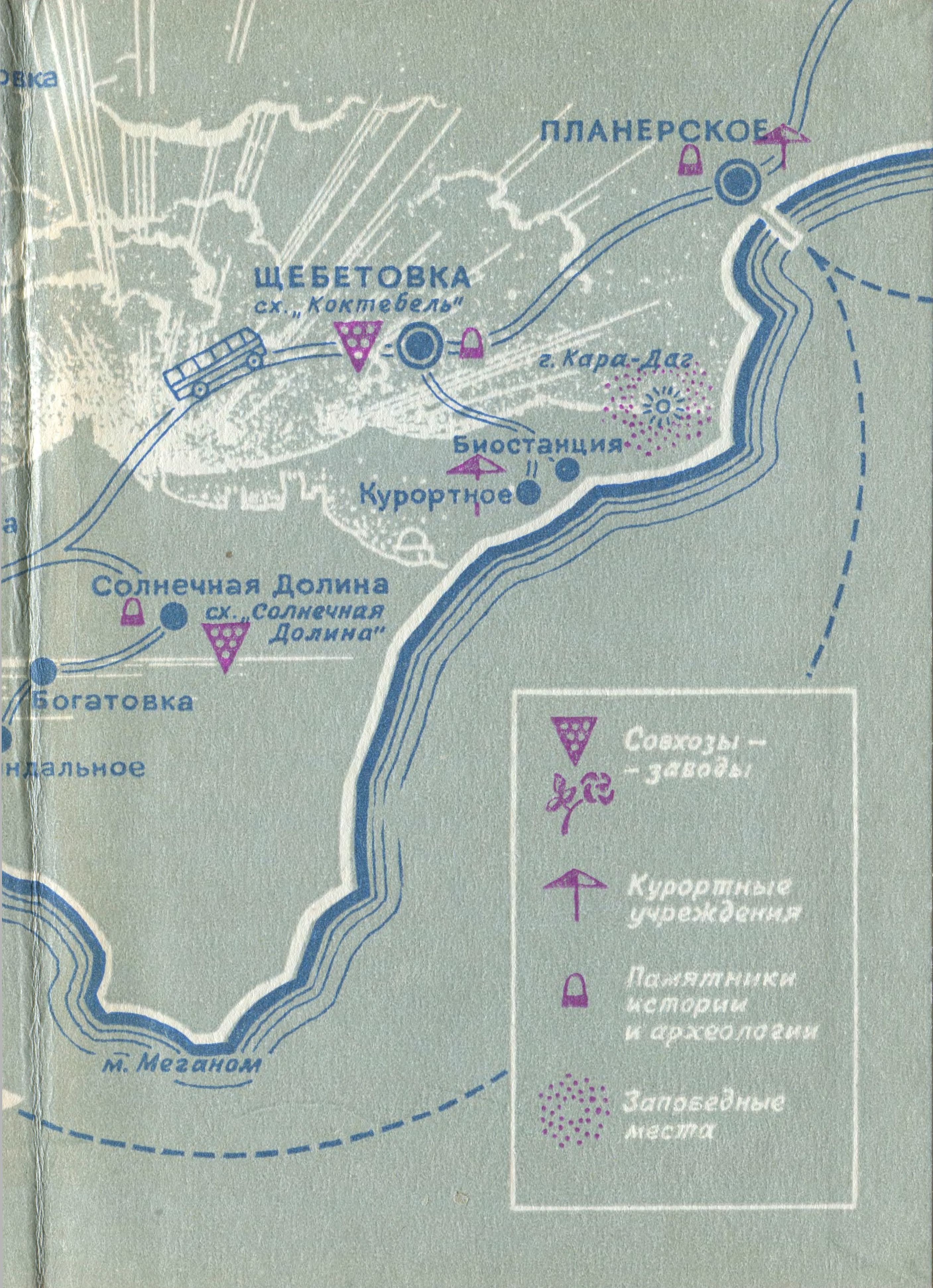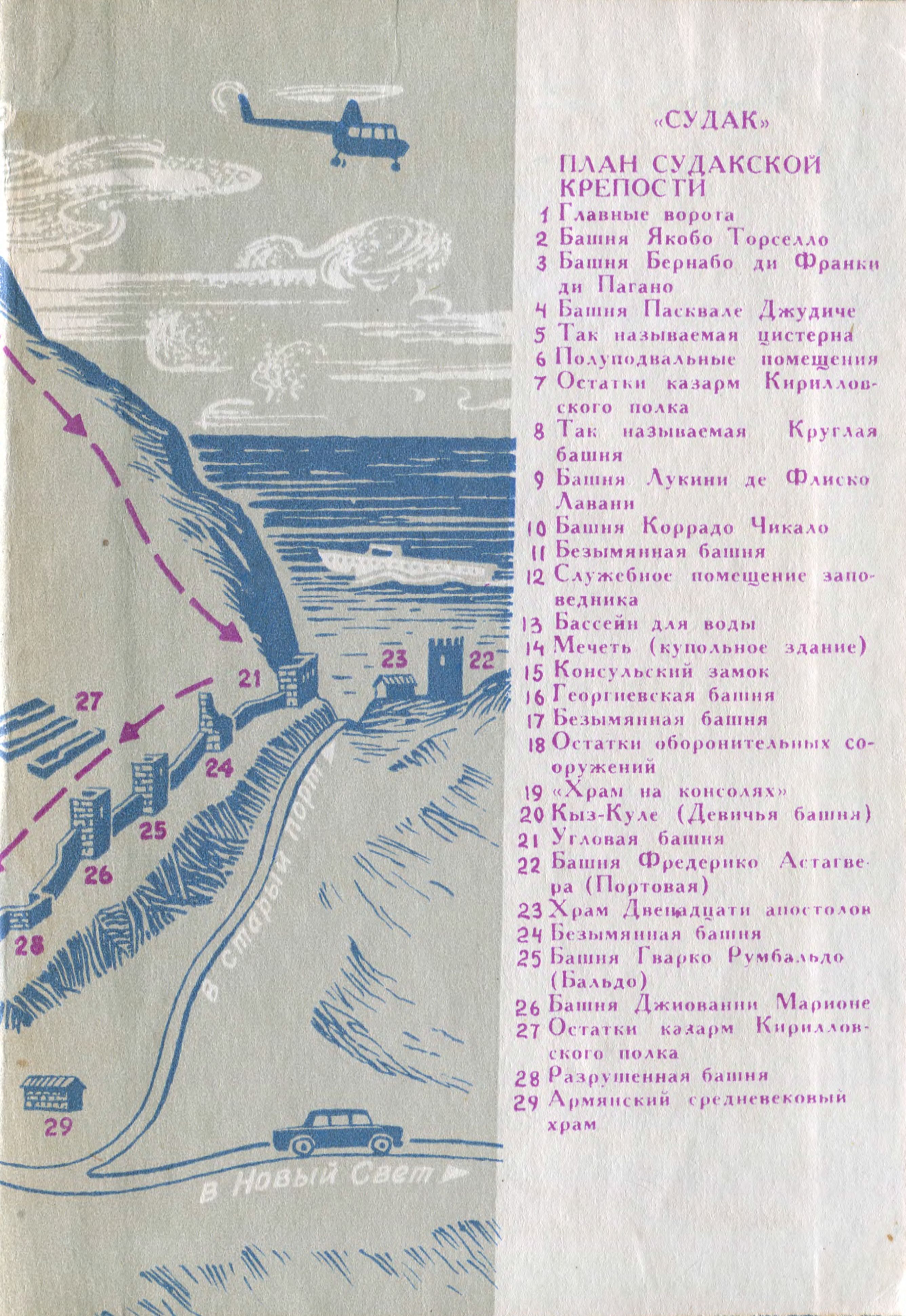 ИллюстрацииСудакская дорога (на переднем плане — Гора Бакаташ) Дом отдыха «Судак». Столовая Санаторий Министерства обороны (на заднем плане — гора Ай-Георгий) Судакская крепость Ворота крепости. Вид изнутри Консульский замок Строительная надпись башни Джудиче Башня Пасквале Джудиче Башня Астагвера (Портовая) и храм Двенадцати апостолов Расчистка древнего колодца на территории крепости «Солдаия, ныне Судак». С литографии П. Францова. Начало XIX в. Академик П.С. Паллас. С гравюры Гейслера. 1802 г. Композиторы А.А. Спендиаров (слева) и А.К. Глазунов. Судак, 1910 г. Композиторы А.А. Спендиаров (слева) и А.К. Глазунов. Судак, 1910 г. Виноградники совхоза-завода «Новый Свет» Один из цехов совхоза-завода Новосветская бухта Гора Капчик Планерское. Дом М.А. Волошина
