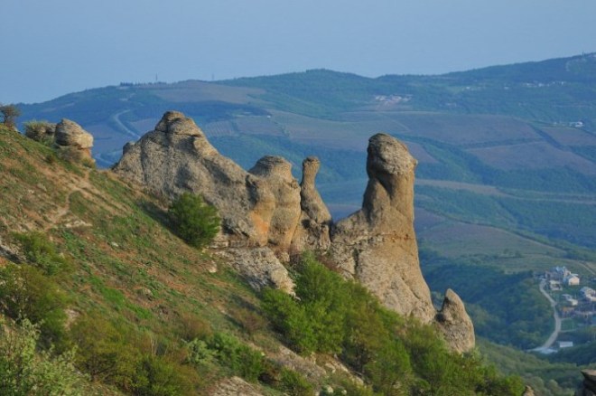 С северной стороны Алушта защищена от холодных ветров горным массивом Демерджи. В переводе с крымско-татарского Демерджи означает «кузнец». Существует версия, что горы обязаны своему названию постоянным скоплениям облаков, напоминающим клубы дыма, курящиеся над главной вершиной массива. Южные склоны Демерджи, состоящие главным образом из конгломератов верхнеюрского периода, сильно подвержены выветриванию. Тысячелетиями постоянно дующие ветры вытачивали из горных пород замысловатые фигуры. Самое большое скопление причудливых скал, получившее название Долина привидений, расположено на западном склоне южной гряды. Прогулка по этим склонам — словно путешествие в сказочную страну, населенную фантастическими существами.
